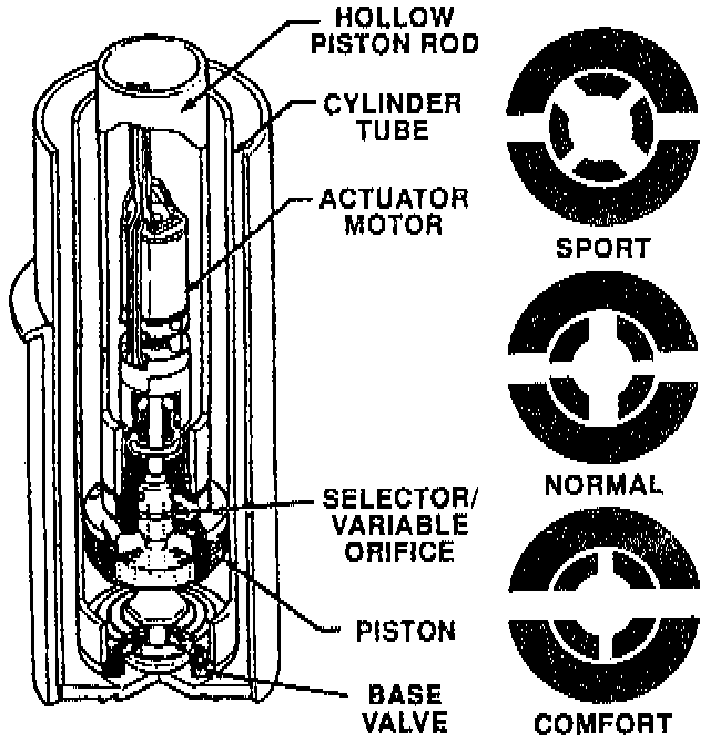 Each strut contains an electrical actuator which rotates a selector valve to a specific location commanded by the Control Module. The selector valve contains different sized orifices which will increase or decrease the damping rate of the strut to control ride firmness. Actuators are an integral part of the strut and are not serviceable separately from the strut.