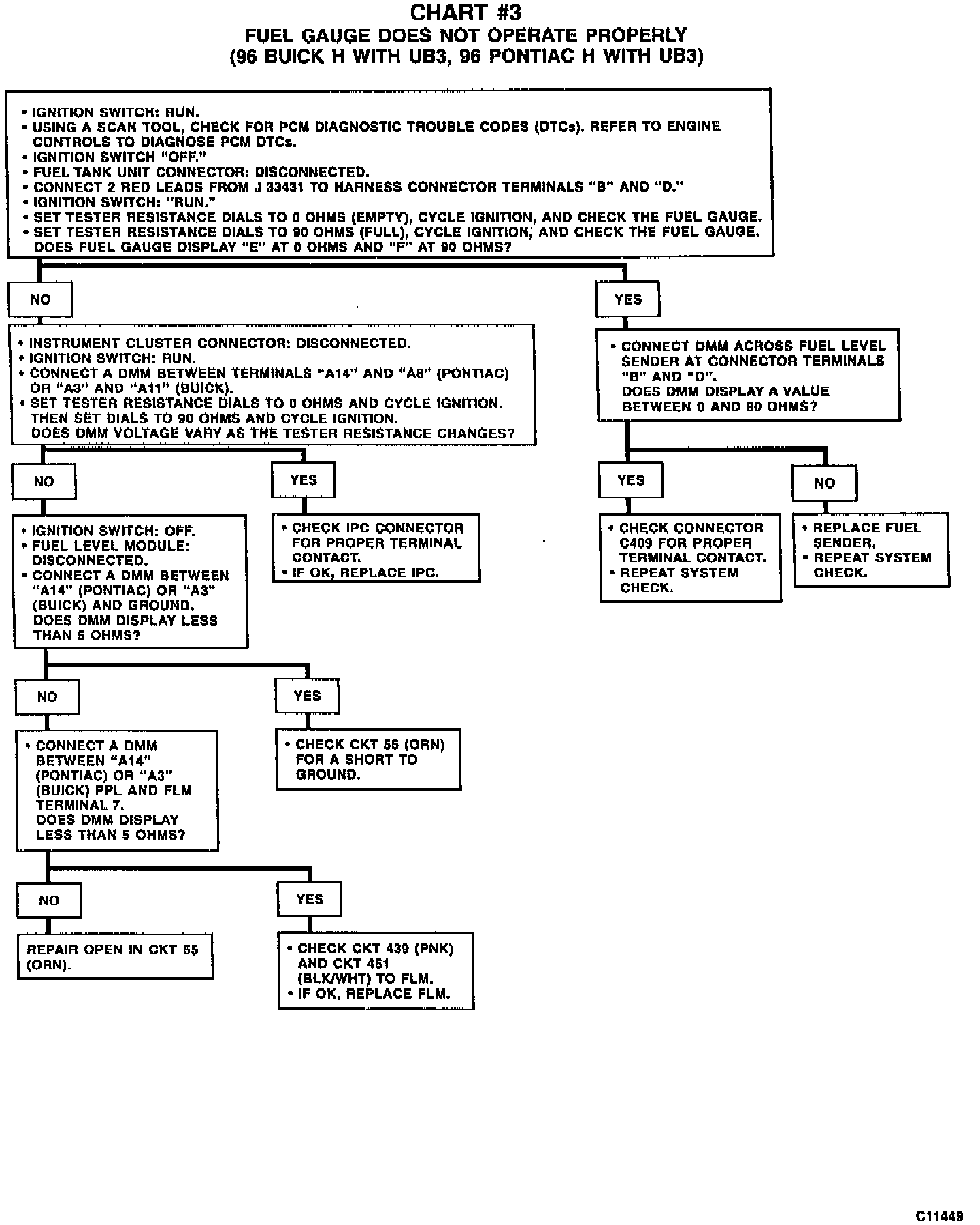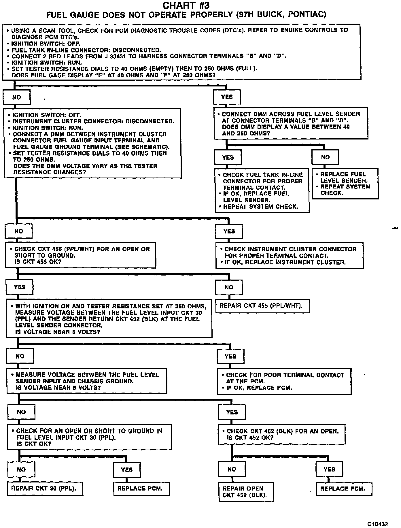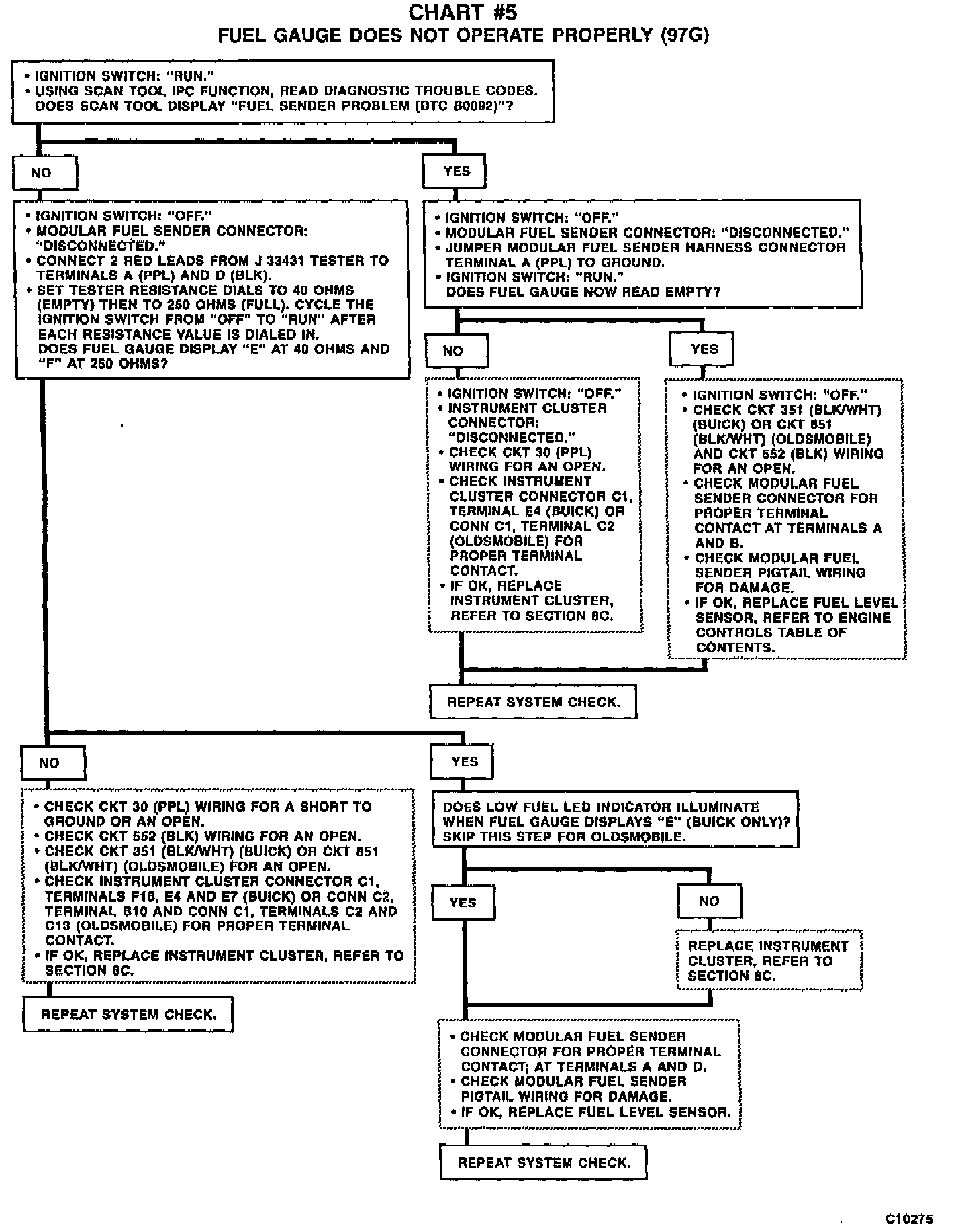 ^ The chart titled "Fuel Gauge Does Not Operate Properly (97 Buick, Pontiac)" includes several improvements to the corresponding charts in the 1997 "H" Service Manual.