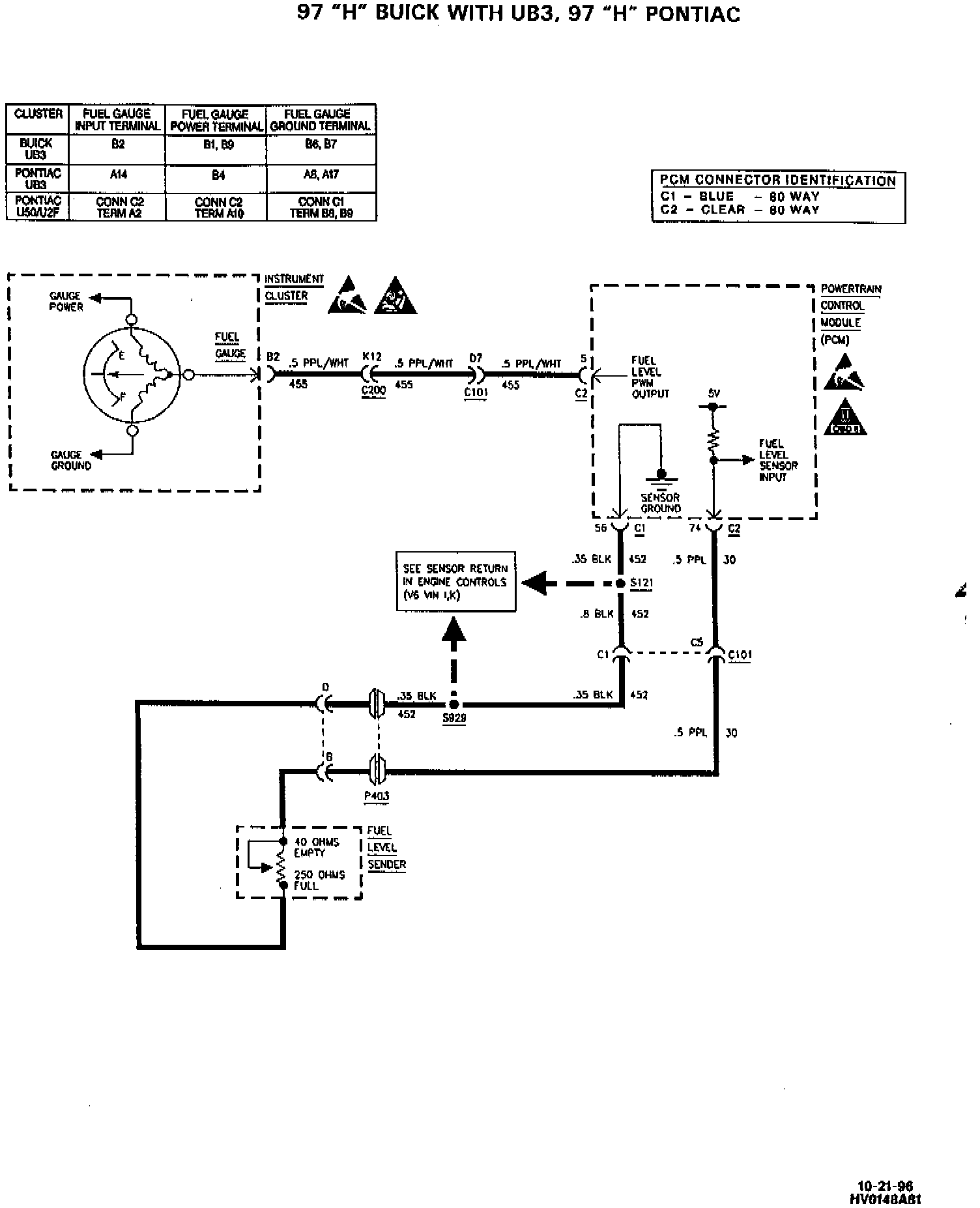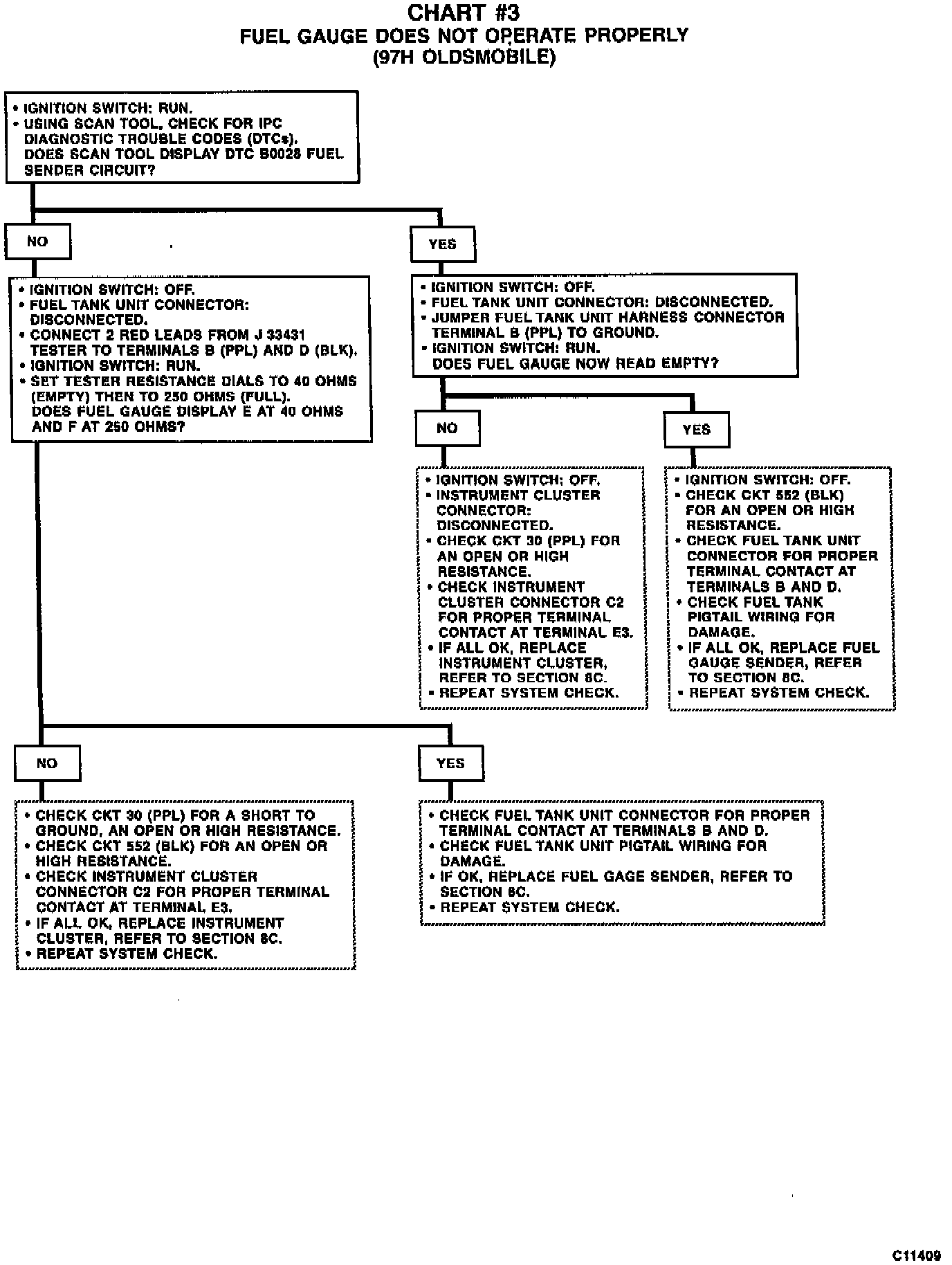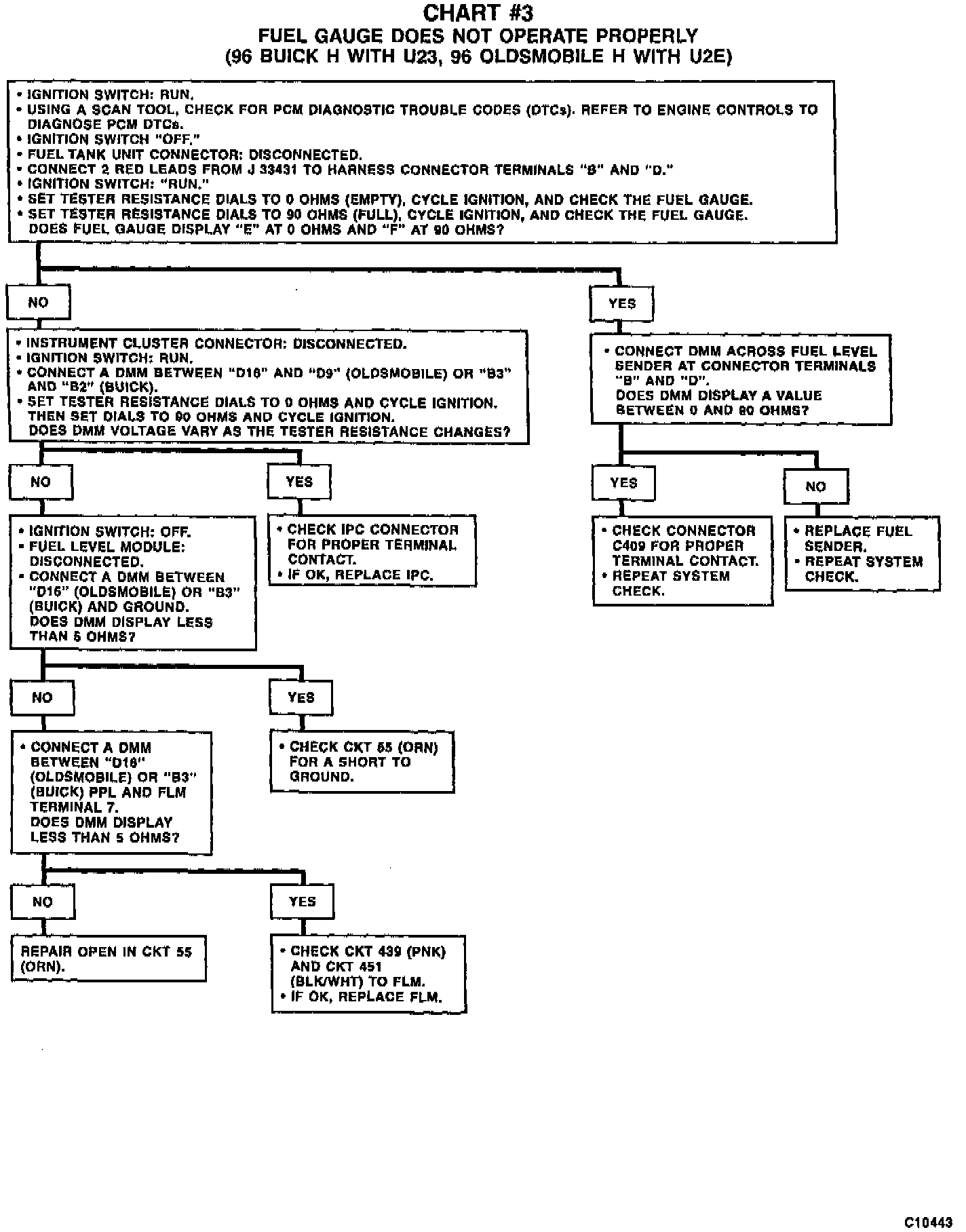 ^ The chart titled "Fuel Gauge Does Not Operate Properly (97 Buick, Pontiac)" includes several improvements to the corresponding charts in the 1997 "H" Service Manual.