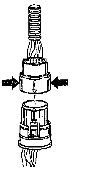 ^ In order to reinstall the external wiring connector, first orient the pins by lining up the arrows on each half of the connector. Push the connector straight down into the transmission without twisting or angling the mating parts.