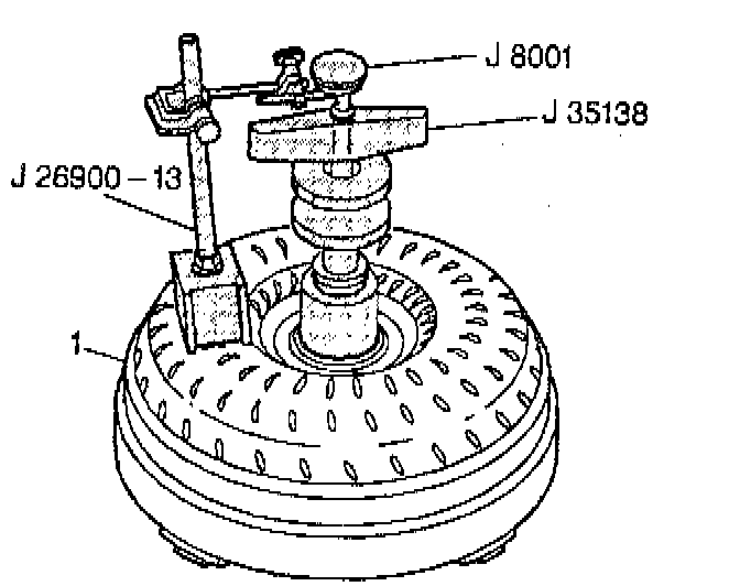 2. Install J26900-13, J35133, and J8001 onto the torque converter (1).
