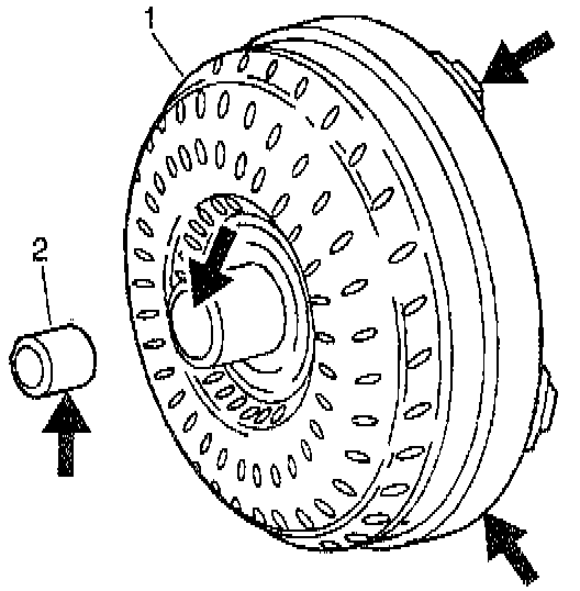 1. Position the torque converter (1) on the bench with the flywheel lugs facing down.