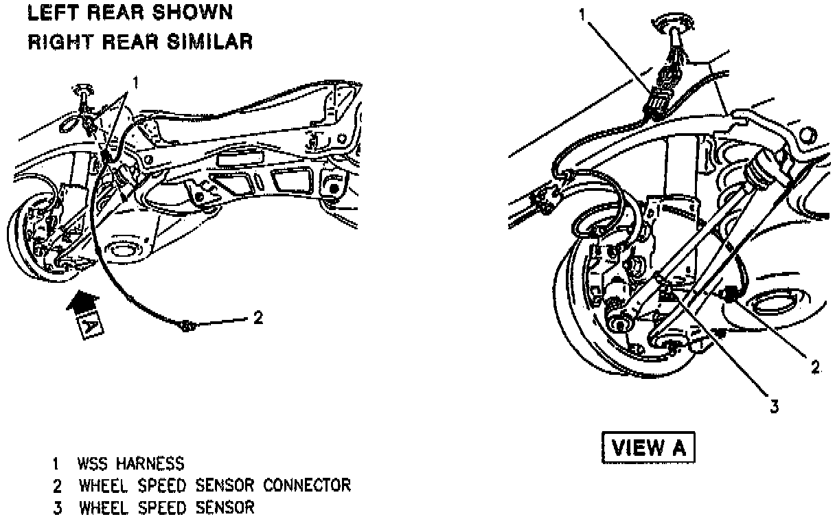 A wheel speed sensor is present at each front wheel bearing assembly and at each rear wheel bearing assembly. The sensors transmit wheel speed information to the Electronic Brake/Traction Control Module (EBCM/EBTCM) by means of an AC voltage. This voltage is generated by magnetic induction caused by passing a toothed sensor ring past a stationary sensor. The signal is transmitted to the EBCM/EBTCM through a pair of wires. The front wheel speed sensor is located in the bearing assembly and is nonadjustable. Sensor gap is set at time of assembly. The rear wheel speed sensors are mounted in the bearing assembly and are non-adjustable. Sensor gap is set at the time of assembly.