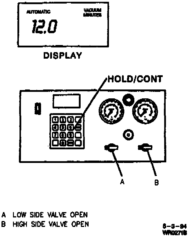 4. At approximately the 12-minute mark on the display (pump has run for three minutes), press "HOLD/CONT." key to stop vacuum pump.