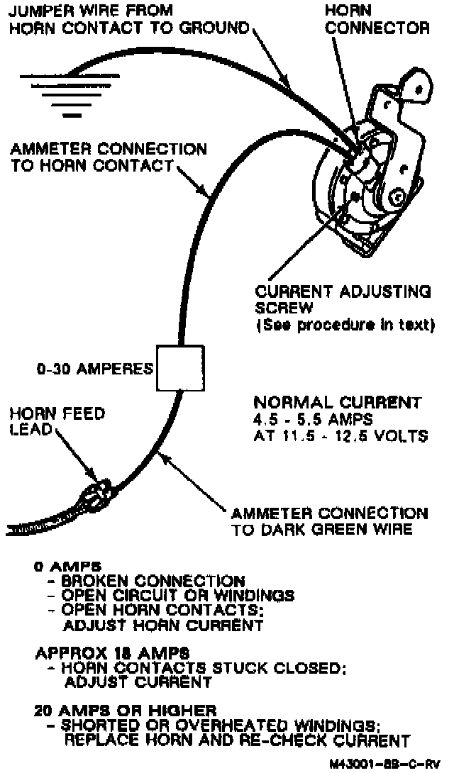 No current reading indicates a broken lead or overheated horn. An overheated horn must be replaced. No current reading may also mean the contact points are open; adjust the horn.