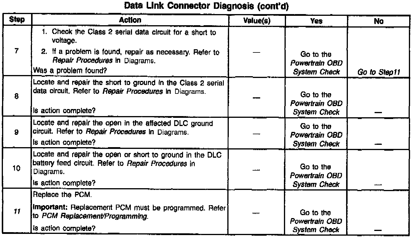 The Class 2 serial data circuit to the Data Link Connector (DLC) allows bi-directional communication between the PCM and the scan tool. If communication between the scan tool and the PCM cannot be established, the procedure in the DLC Diagnosis table should be used to diagnose the condition.