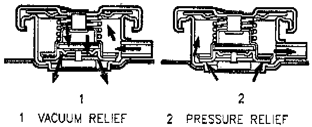 The radiator cap is designed to prevent accidental removal. The finger grips have been removed so that the cap is round in shape. It must be pushed downward before it can be removed. A rubber/asbestos gasket is added to the diaphragm spring at the top of the cap. Also, embossed on the cap is a caution against its being opened and arrows indicating the proper closed position.