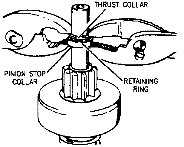2. Test assembly drive action. The pinion should turn freely in the overrunning direction. check pinion teeth to see that they have not been chipped, cracked, or excessively worn. Replace assembly when necessary. Badly chipped pinion teeth can indicate chipped ring gear teeth, which should he replaced when necessary.