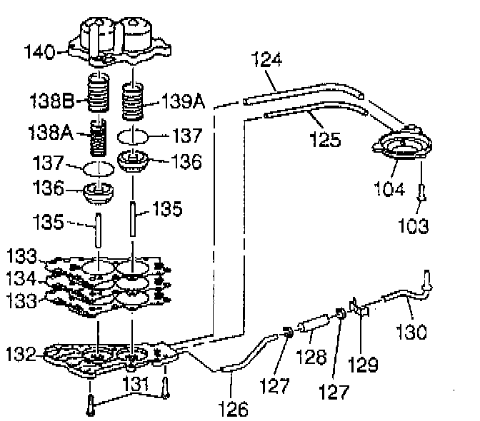 5. Disassemble the manual 2-1 band servo. Remove the forward band servo oil pipes (124, 125), and remove the lube oil pipe assembly (126) from both the accumulator cover (132) and from the manual 2-1 band servo cover (104).