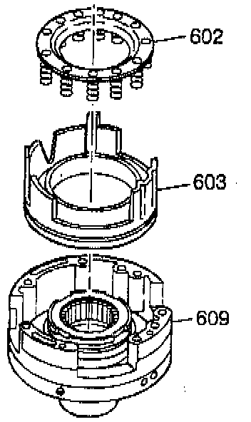 2. Remove the spring assembly (602) and remove the fourth clutch piston assembly (603) from the driven sprocket support assembly (609).