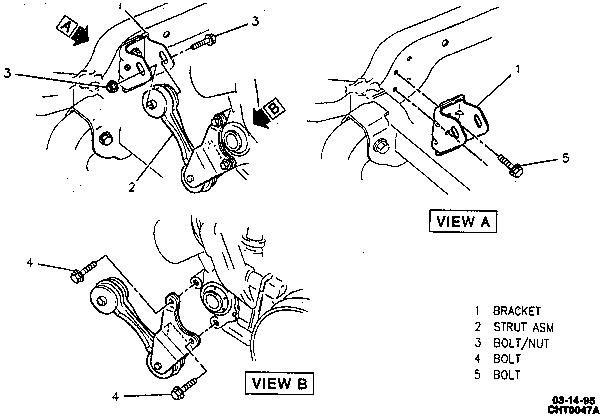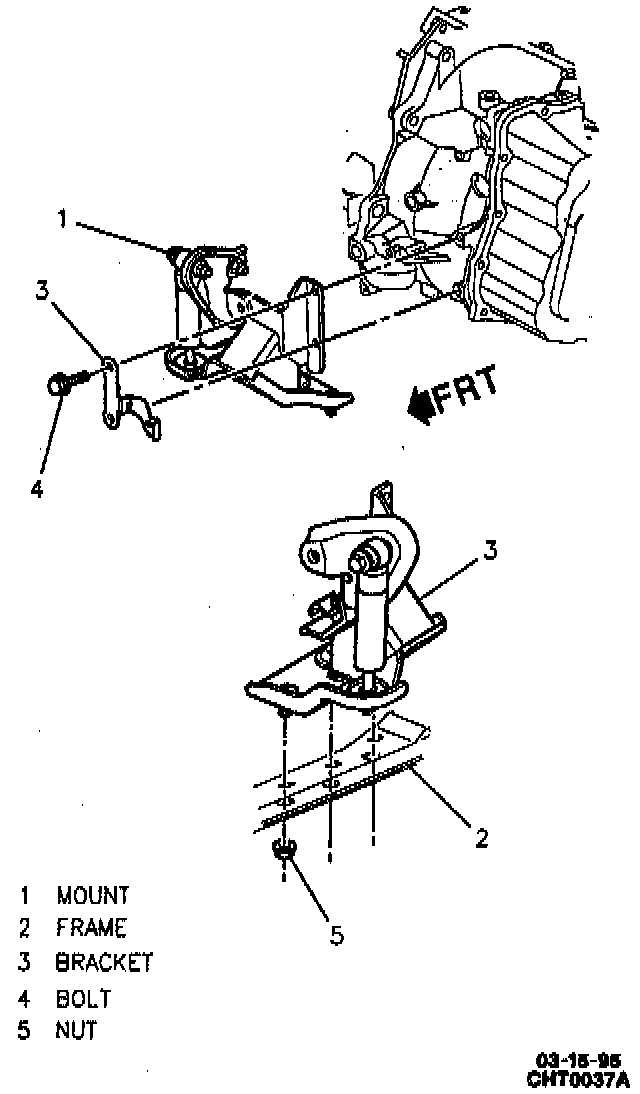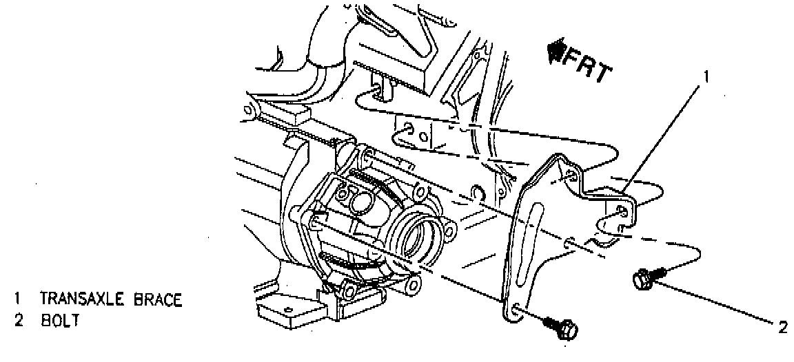 ^ When installing transaxle to engine block brace, tighten brace to engine bolts first and brace to transaxle case last to avoid pulling transaxle case out of line.