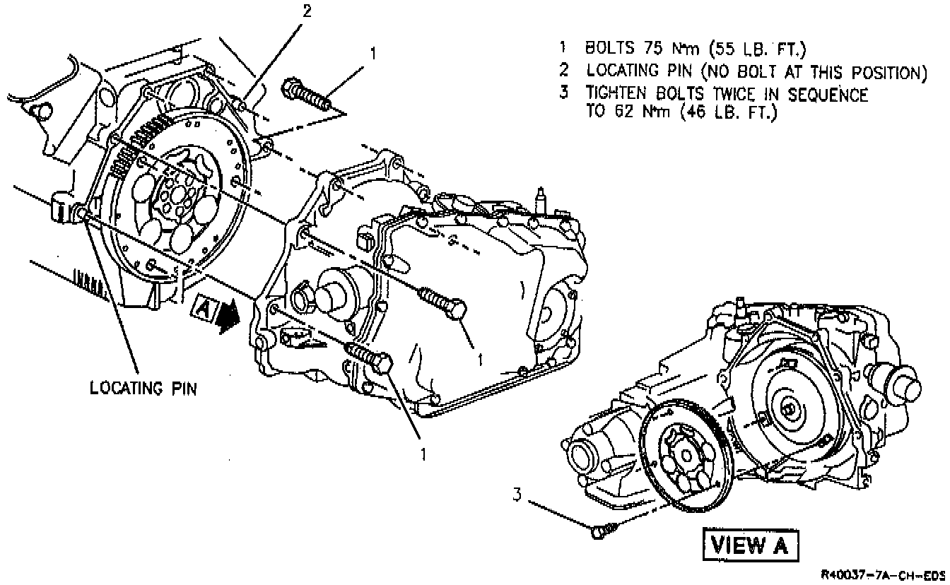 ^ Torque converter to flywheel bolts should always be tightened twice. The final torque should be 62 Nm (46 ft. lbs.).