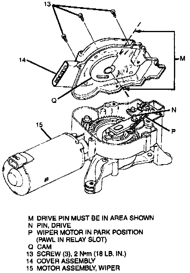 2. Operate wiper motor assembly (15) back into park position (pawl in relay slot).