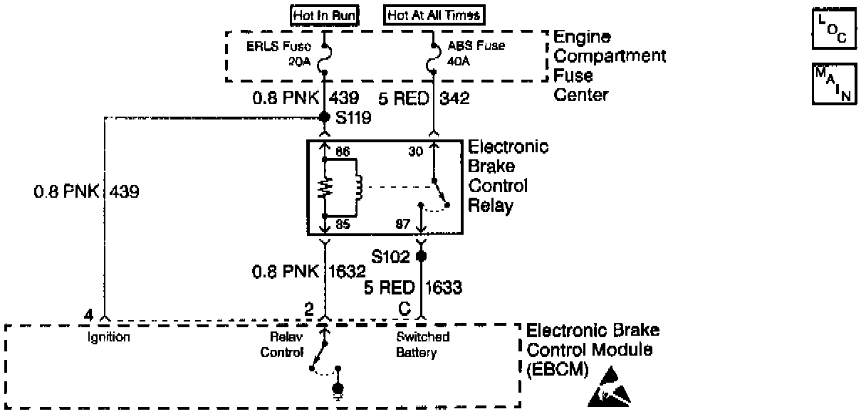 Ignition voltage is supplied to terminal 86 of the Electronic Brake Control Relay. The above condition enables the Electronic Brake Control Module (EBCM) to energize the pull-in coil by completing the ground circuit at connector terminal 2 of the EBCM. The magnetic field created closes the Electronic Brake Control Relay contacts. The magnetic field also allows battery voltage and current through the Electronic Brake Control Relay terminal 30 to be supplied to the EBCM through connector terminal C. Connector terminal C supplies power to the EBCM, which supplies power to the motors and solenoids.