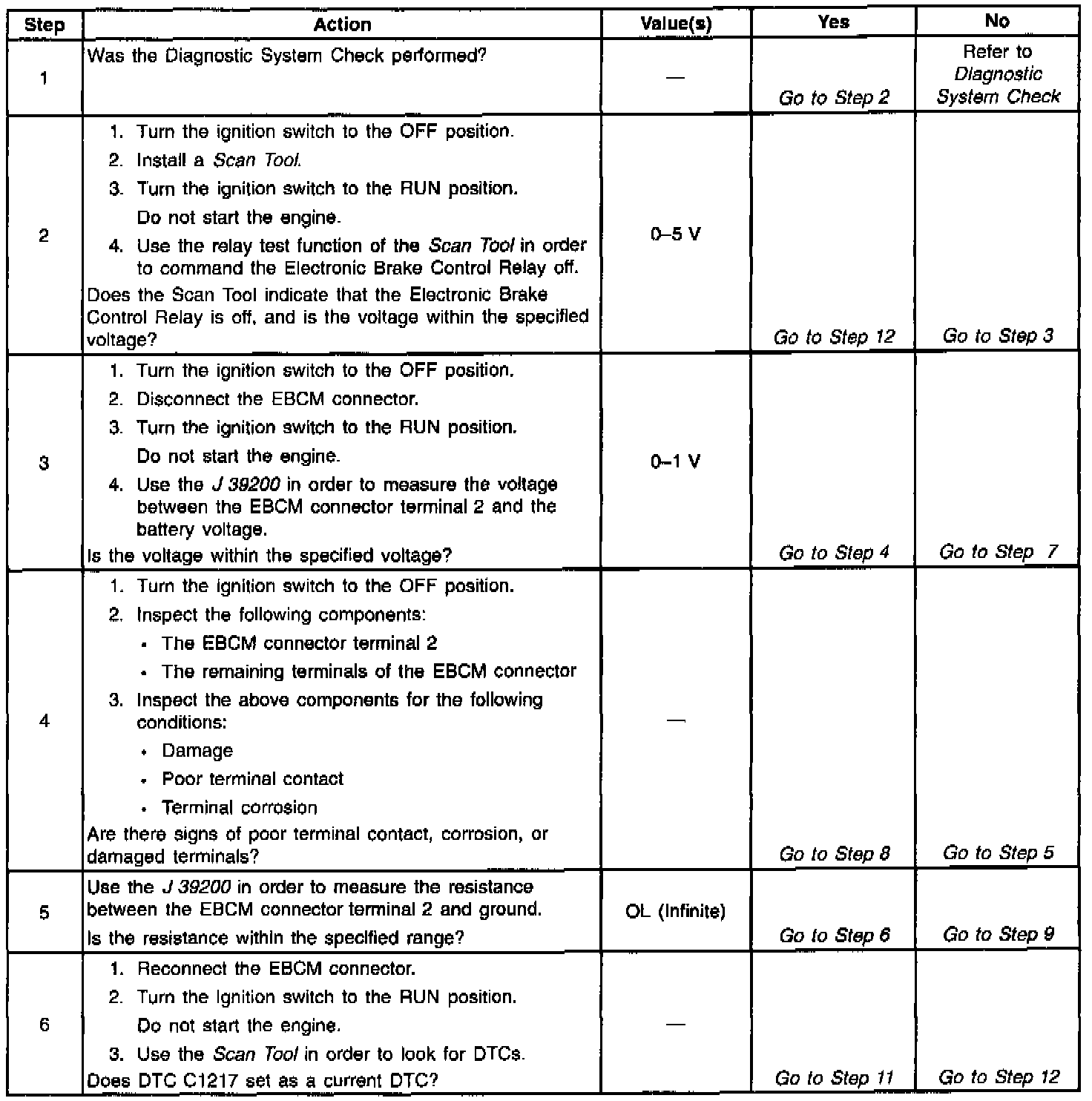 DTC C1217 determines if the Electronic Brake Control Relay energizes when the Electronic Brake Control Relay should not energize. The above malfunction would not allow the Electronic Brake Control Relay to remove power to the ABS system.