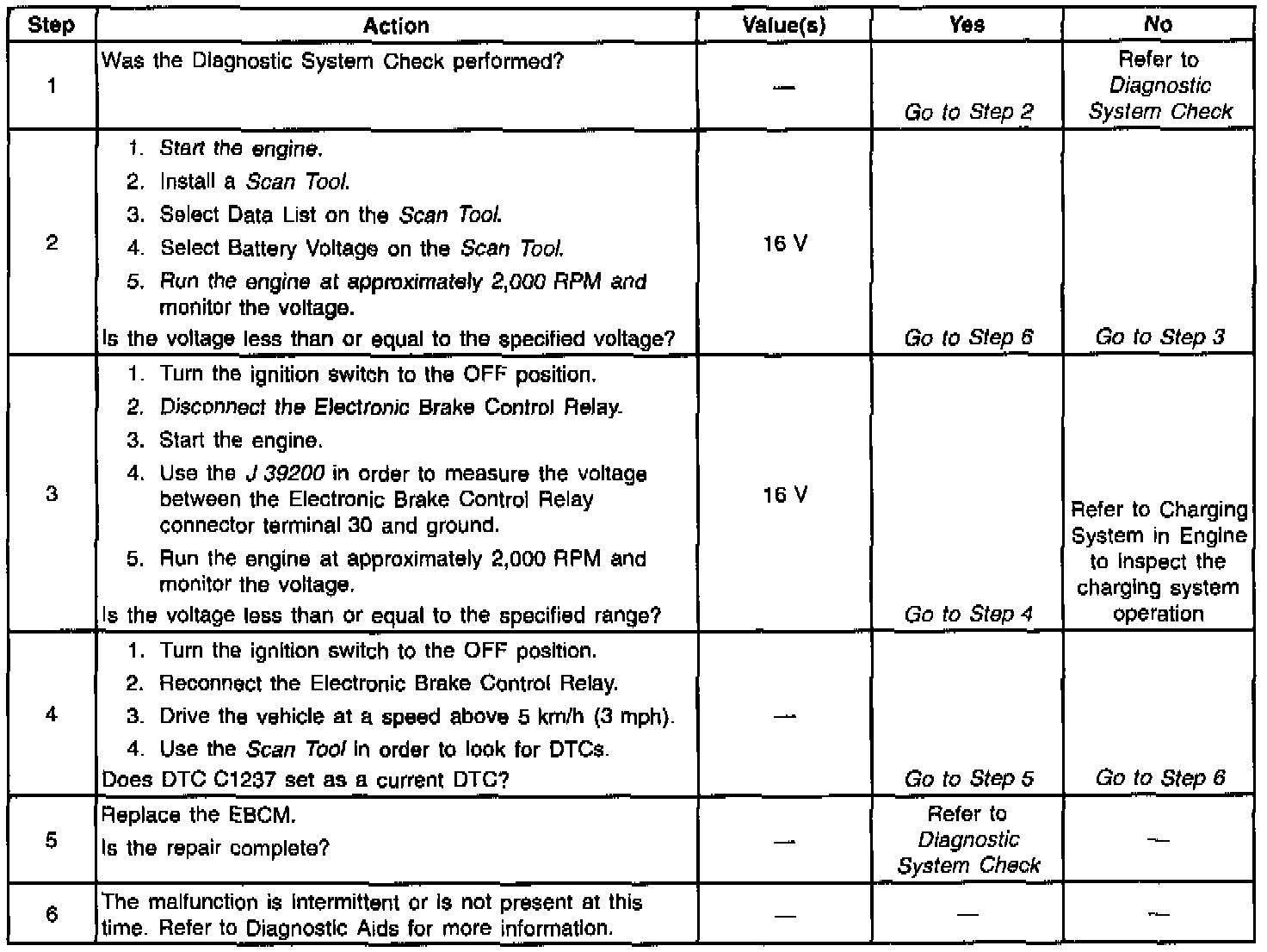 DTC C1237 detects high vehicle voltage levels prior to any required motor movement (initialization or ABS). Damage to the system may occur if excessive voltage exists.