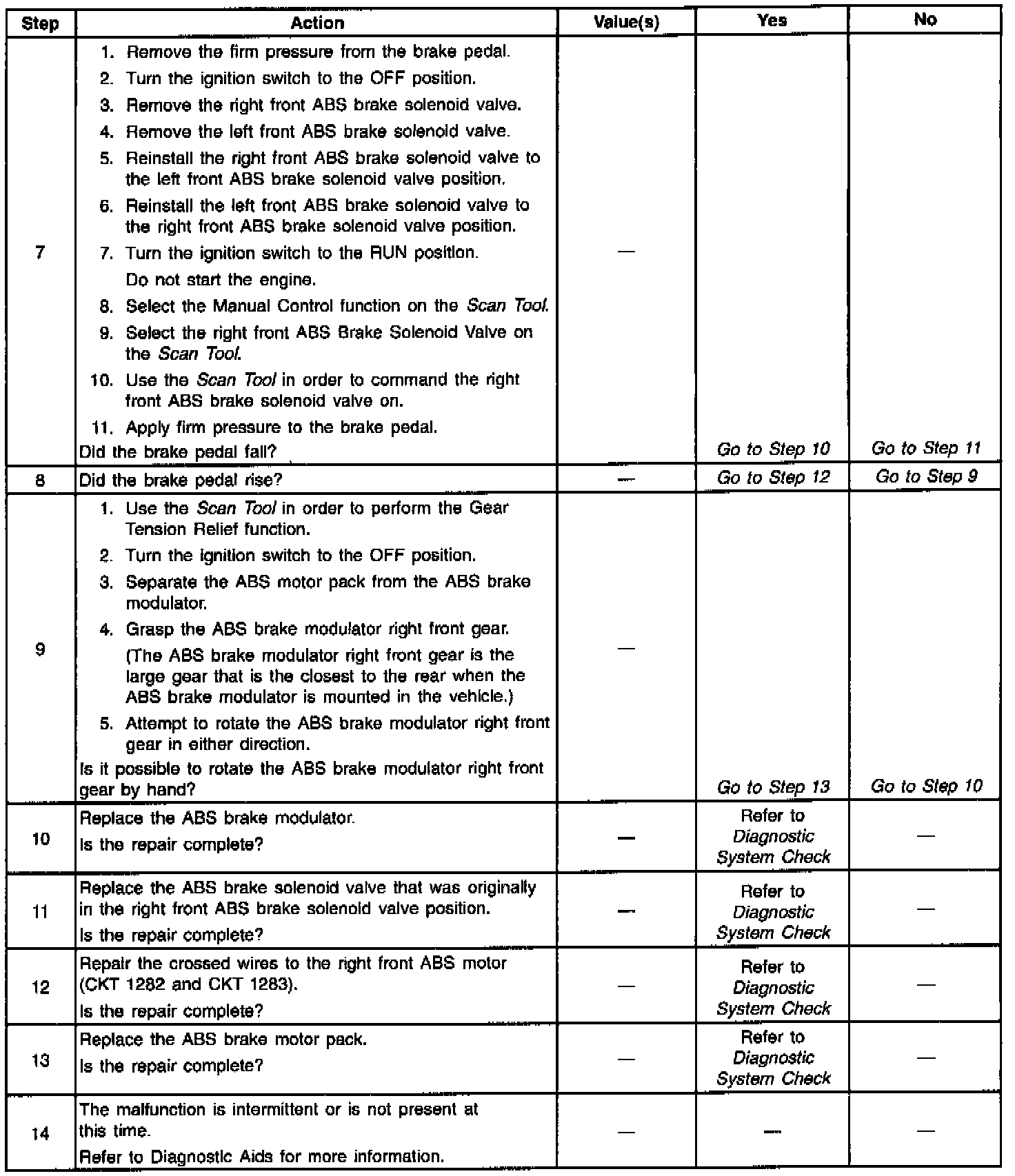 Use the enhanced diagnostic function of the Scan Tool in order to measure the frequency of the malfunction. DTC C1253 may occur if the vehicle is on ice and the steering wheel is turned to lock during braking. Use the scan tool hydraulic test to ensure the total brake system is functional.