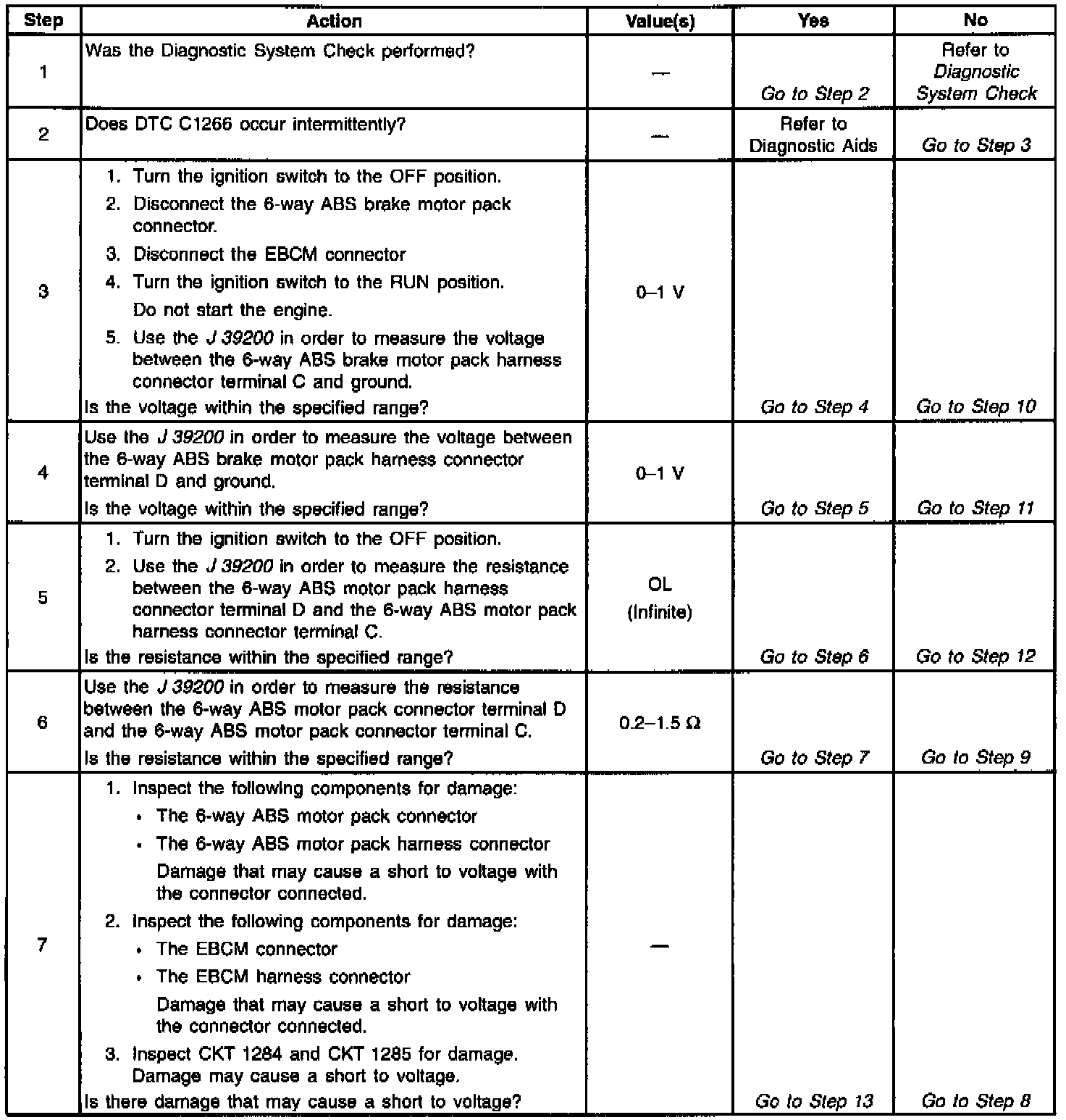 DTC C1266 identifies an ABS motor circuit that shorts to voltage or an ABS motor that has low or zero resistance. The malfunction will cause one of the following conditions to occur: