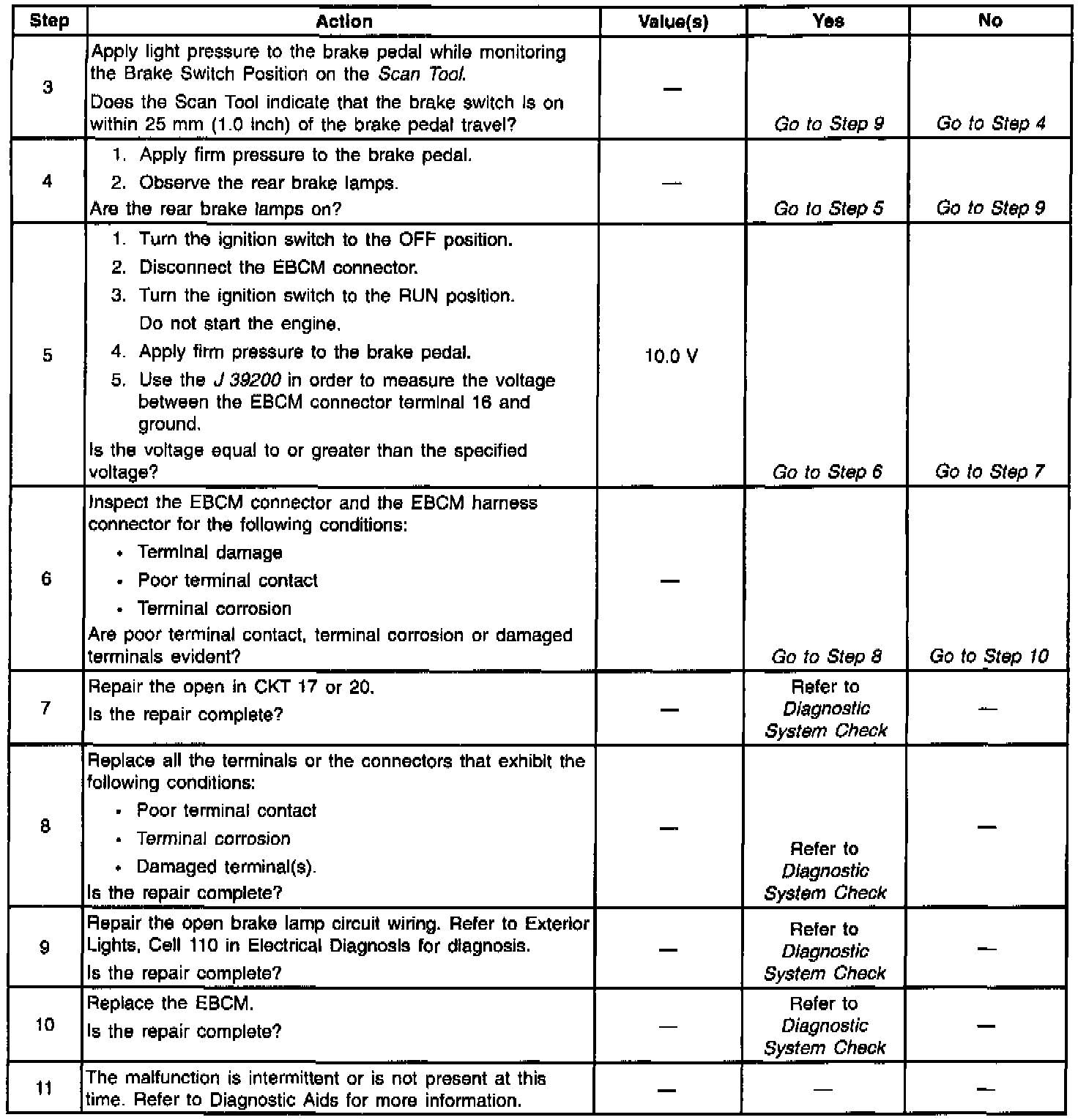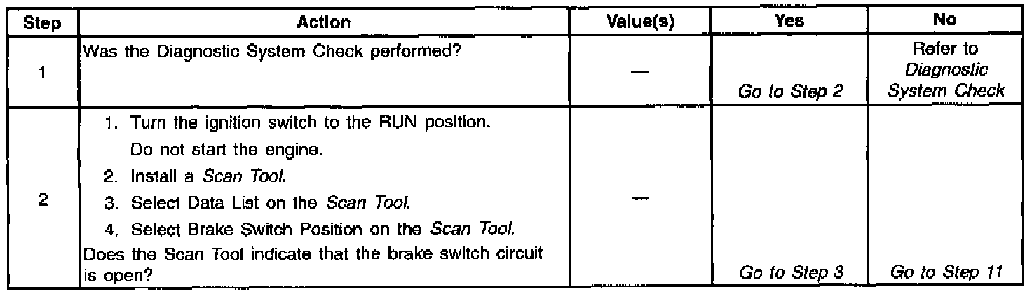 A malfunction exists if the brake switch input voltage is out of specification for one second. An open circuit exists when the brake switch input voltage is out of specification.