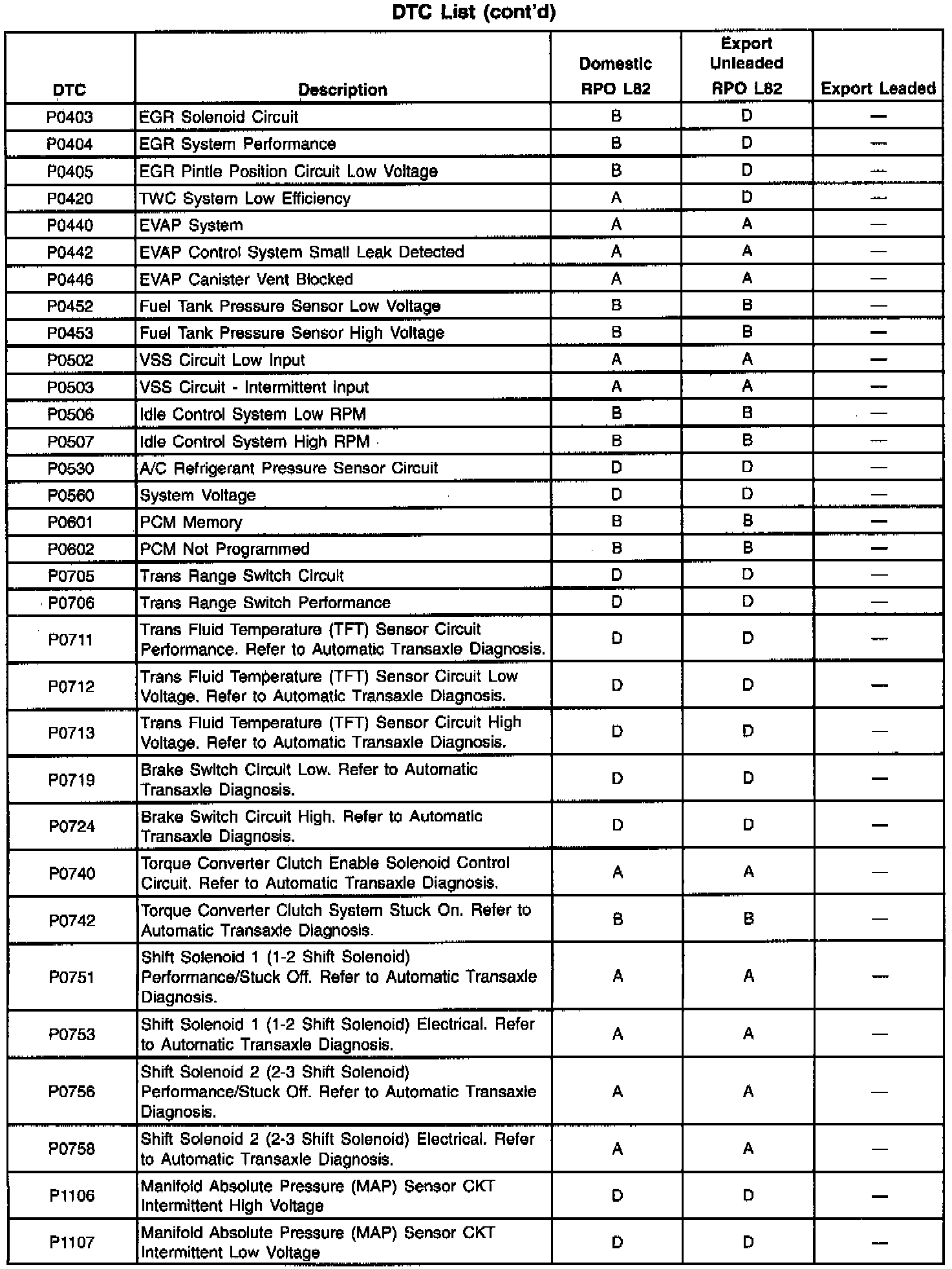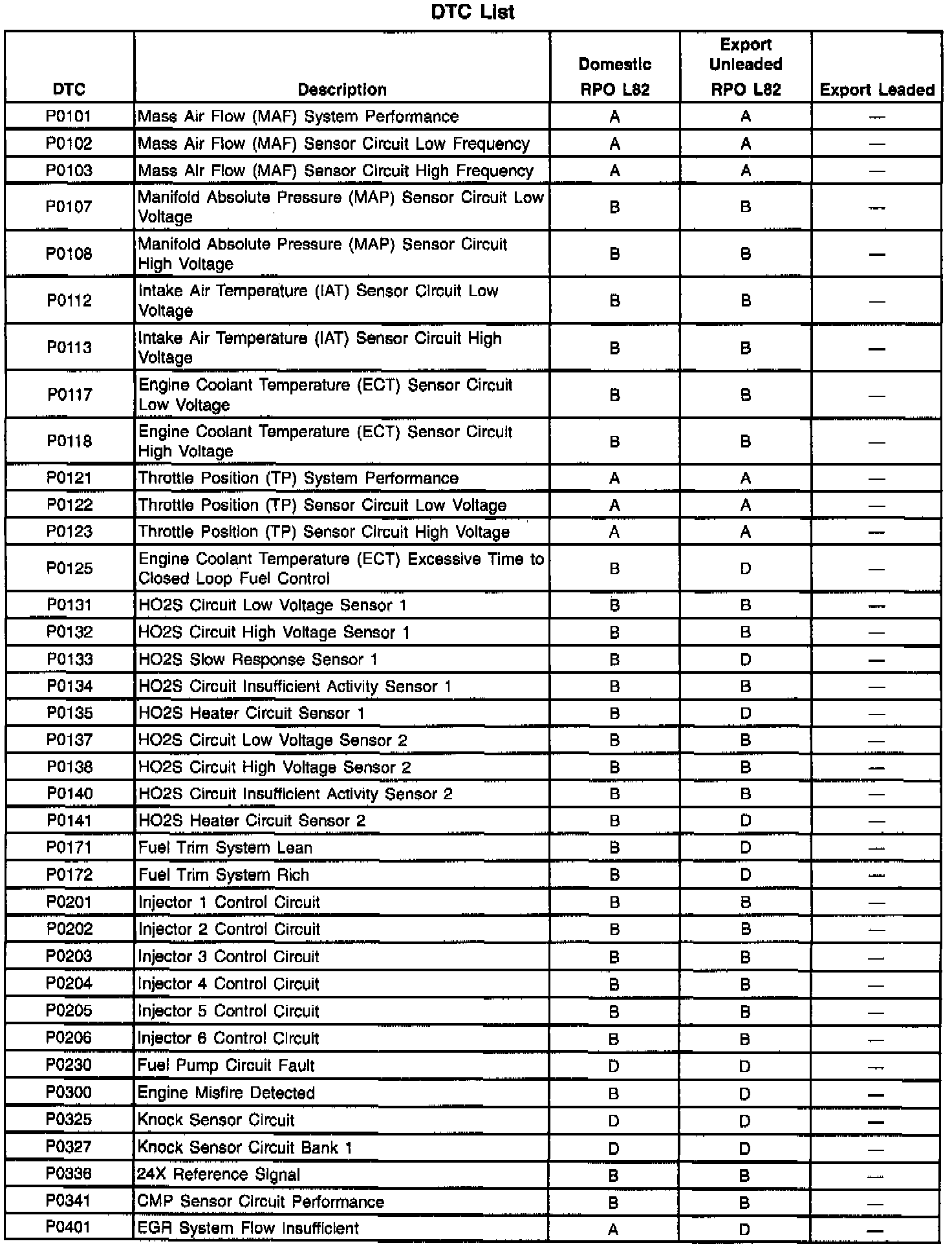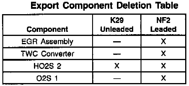 If a system is malfunctioning and the associated DTC has been disabled (Type X), it may be beneficial to use the diagnostic table as a guide to aid in diagnosis. Many of the DTC tables include a functional check of the system that may pinpoint a problem. However, it is important to remember that the DTC tables are specifically designed for use only when a DTC is set. Therefore, a thorough understanding of the normal operation of the system being diagnosed is necessary and use of the tables for this purpose is at the discretion of the technician. An export vehicle may have unrequired emissions components removed. If a component is removed, the deletion table below will mark that components box with an X.