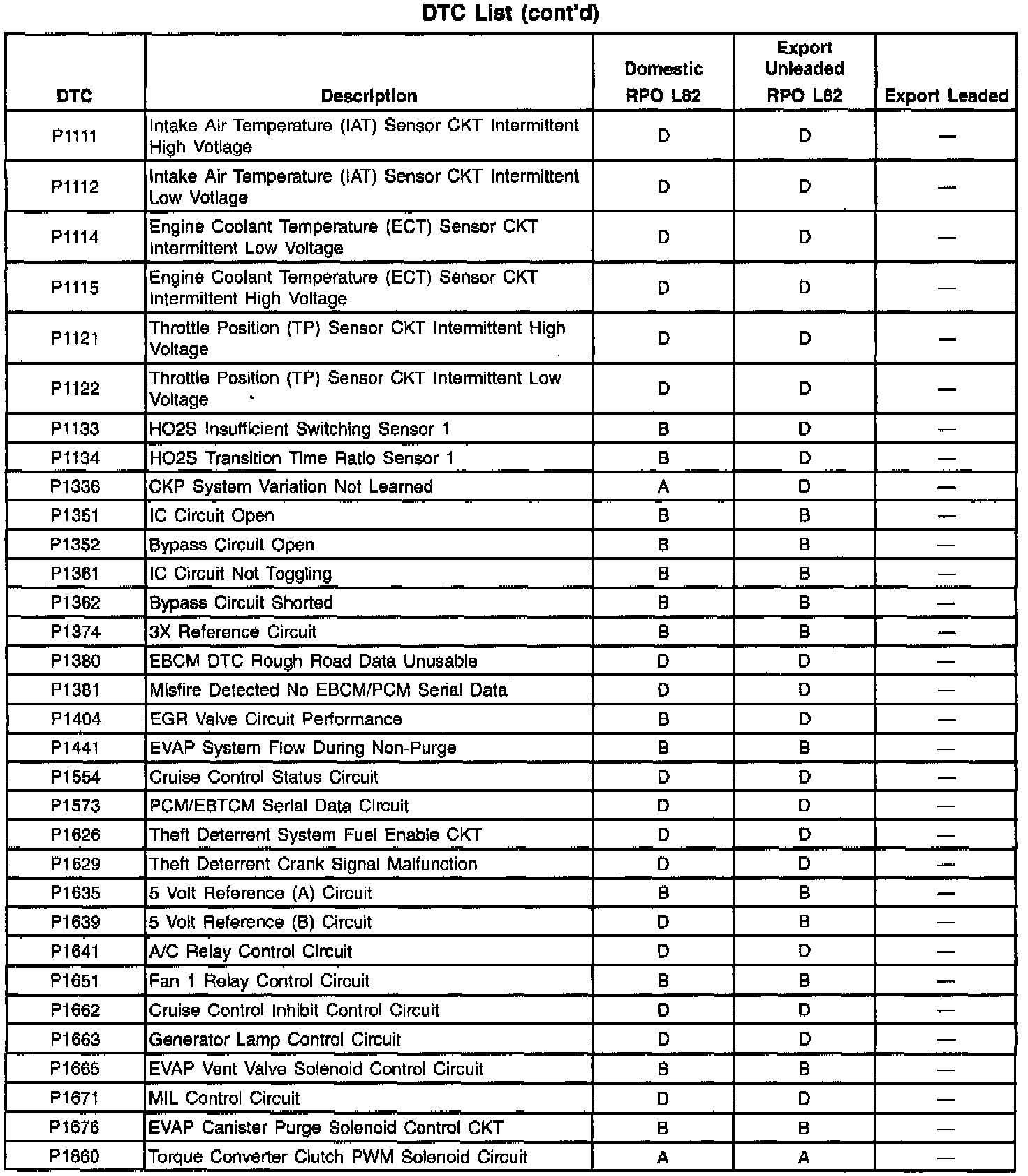 The service information contained in this database refers to the Federal calibration package. The export change is NOT reflected in the service information in the DTC's diagnostic support information or in the Repair Instructions. Export vehicles may have differences in DTC types that will affect Malfunction Indicator Lamp (MIL) operation. Certain DTCs have been changed from type A to type C or, in some cases, type X. When a type A diagnostic fails, a DTC is set immediately and the Malfunction Indicator Lamp (MIL) is illuminated. When a type B DTC diagnostic fails, the Malfunction Indicator Lamp (MIL) will illuminate if the fault is present after two consecutive drive trips. A type C DTC will set after one failure and be stored in history but will not illuminate the Malfunction Indicator Lamp (MIL). Type X DTCs have been turned off. The diagnostic does not run, no codes are stored, and the Malfunction Indicator Lamp (MIL) will not illuminate.