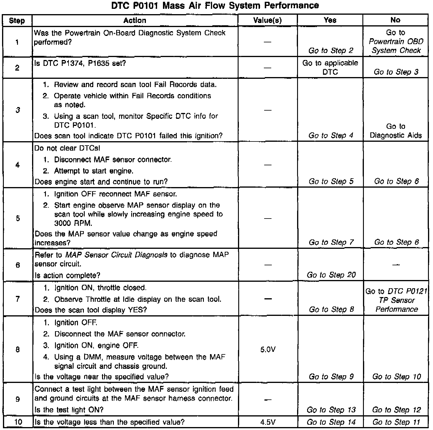 ^ The actual Mass Air Flow is compared to a calculated Mass Air Flow based on the MAP, TP, and engine RPM readings (speed density). A skewed/unresponsive MAP sensor at key on will cause the calculated Mass Air Flow value to be inaccurate. When the engine is started a large difference between actual Mass Air Flow and Calculated Mass Air Flow occurs. DTC P0101 will set, the vehicle will stall, a default Mass Air Flow based on the MAP sensor will occur. Because the MAP sensor is skewed/unresponsive the default Mass Air Flow values are incorrect and vehicle may not restart. If a fault occurs which causes the MAP sensor value to be incorrect (poor vacuum connections, damaged vacuum source, or defective vacuum hose(s), unmetered air into the manifold), DTC P0101 will set and the default mass airflow value will be substituted. Because the MAP sensor value is incorrect the vehicle may not start and run.