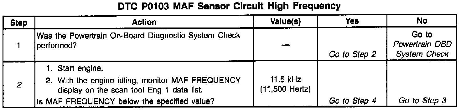 The MAF sensor produces a frequency signal which can be monitored using a scan tool. The frequency will vary within a range of around 2000 Hertz at idle to near 10,000 Hertz at maximum engine load. DTC P0103 will be set if the signal from the MAF sensor is above the possible range of a normally operating MAF sensor.