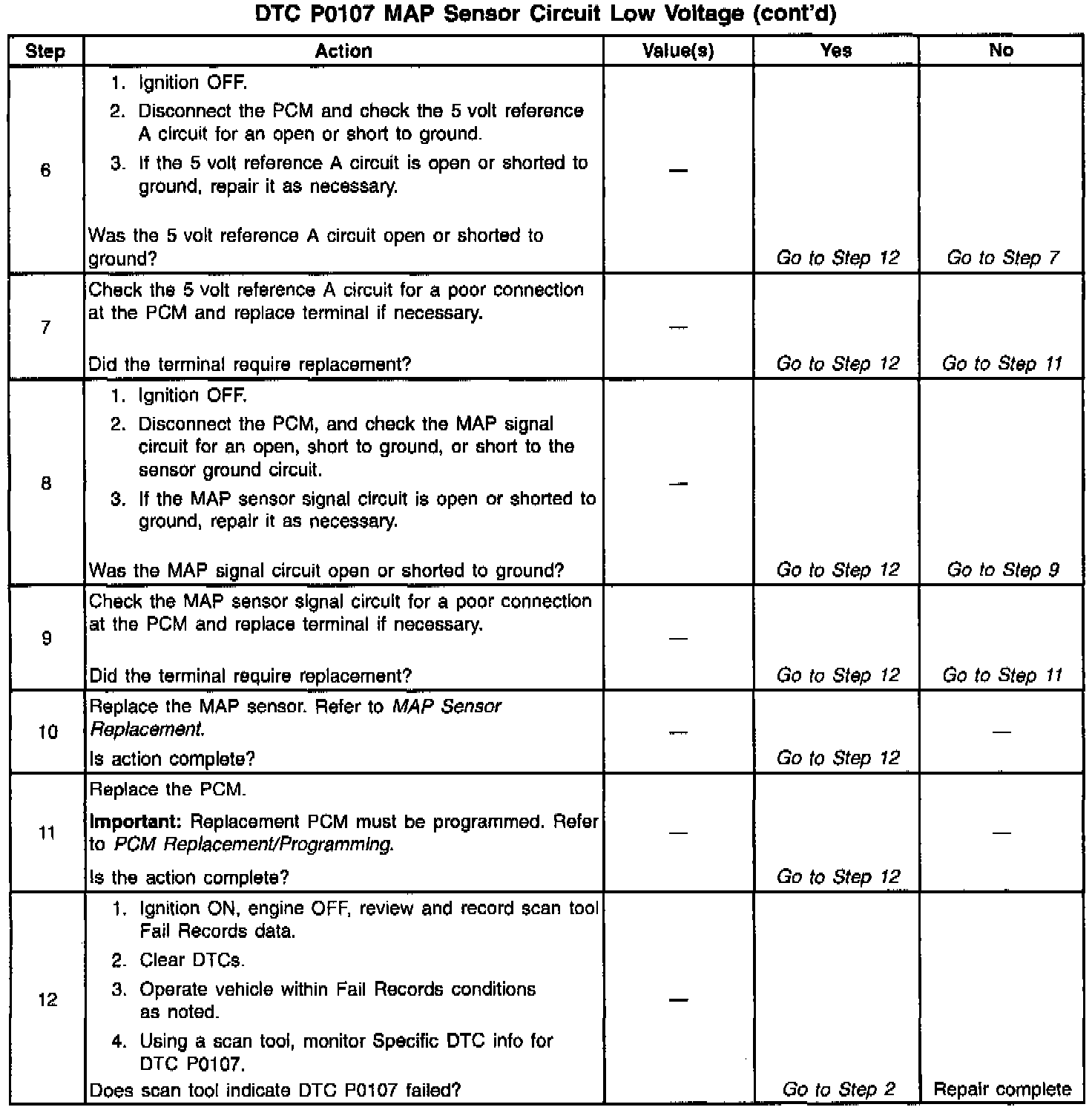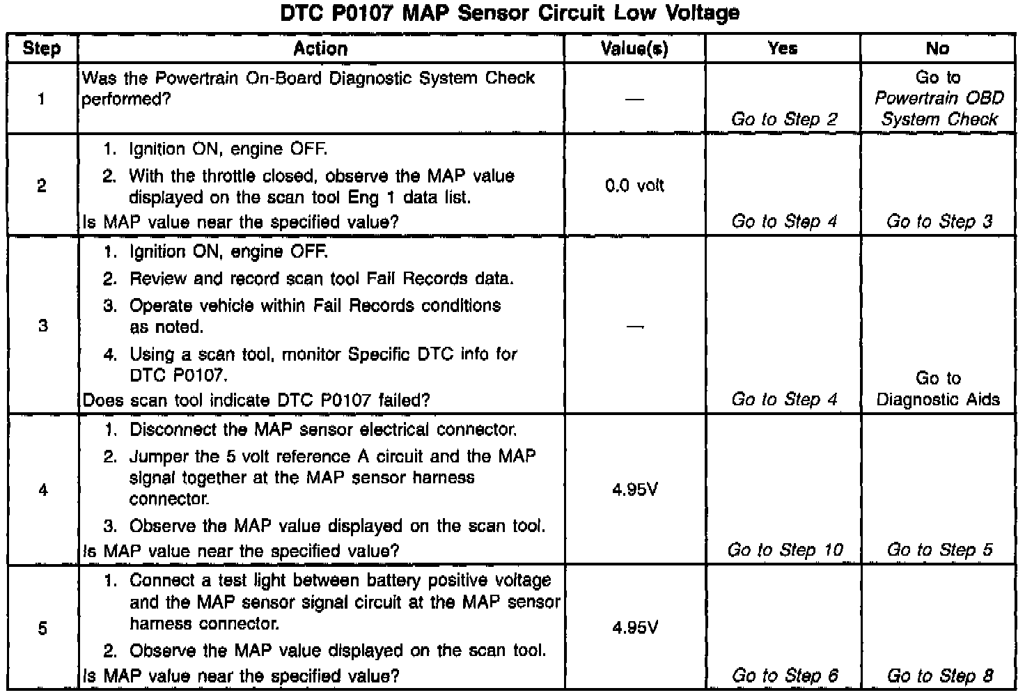 The MAP sensor is used to determine manifold pressure changes while the EGR flow test diagnostic is being run (refer to DTC P0401), to determine engine vacuum level for some other diagnostics and to determine barometric pressure (BARO). The PCM monitors the MAP signals for voltages outside the normal range of the MAP sensor. If the PCM detects a MAP signal voltage that is excessively low, DTC P0107 will be set.