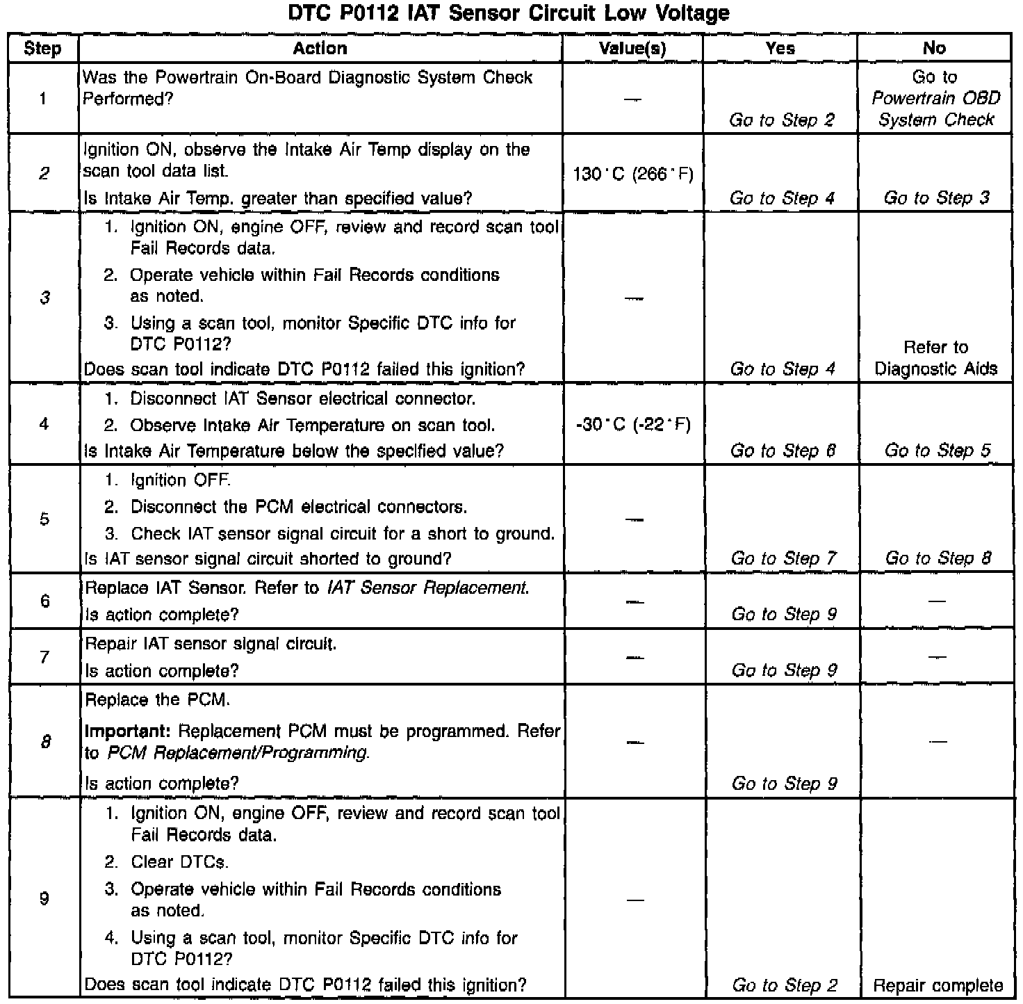 3. If DTC P0112 can be repeated only by duplicating the Fail Records conditions, refer to Specifications / Electrical / Temperature vs. Resistance Value table. The table may be used to test the IAT sensor at various temperatures to evaluate the possibility of a shifted sensor that may be shorted above or below a certain temperature. If this is the case, replace the IAT sensor. If the IAT sensor appears to be OK, the fault is intermittent refer to Diagnostic Aids.