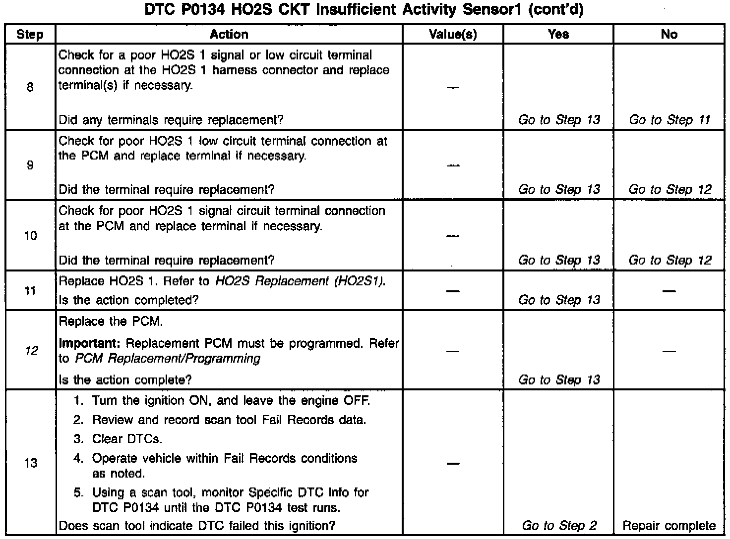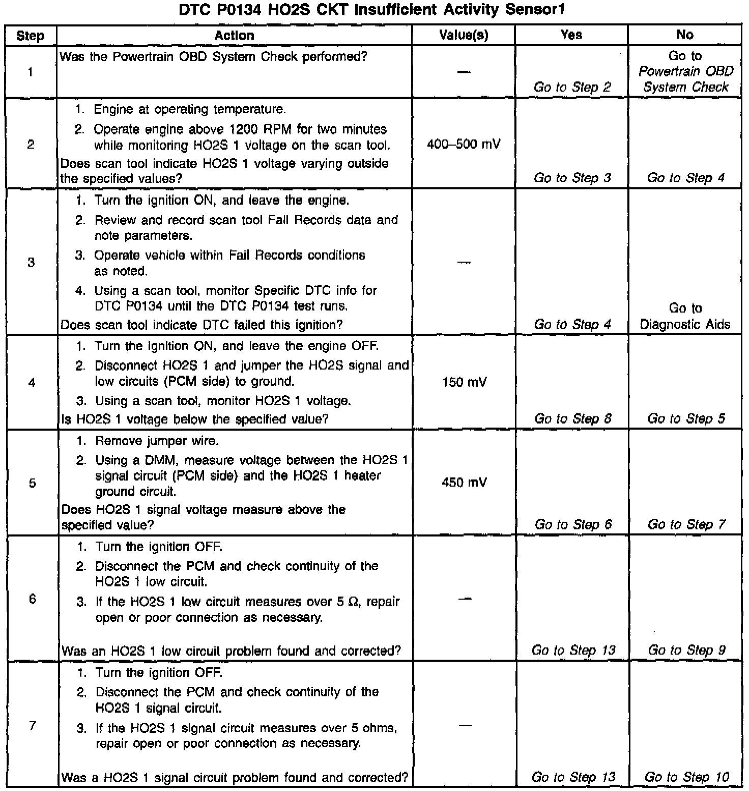 The PCM supplies a bias voltage of about 450 mV between the HO2S signal and low circuits. When measured with a 10 megaohm digital voltmeter, this may display as low as 320 mV. The oxygen sensor varies the voltage within a range of about 1000 mV when the exhaust is rich, down through about 10 mV when exhaust is lean. The PCM constantly monitors the HO2S signal during closed loop operation and compensates for a rich or lean condition by decreasing or increasing injector pulse width as necessary. If the Front Heated Oxygen Sensor (HO2S 1) voltage remains at or near the 450 mV bias for an extended period of time, DTC P0134 will be set, indicating an open sensor signal or sensor low circuit.