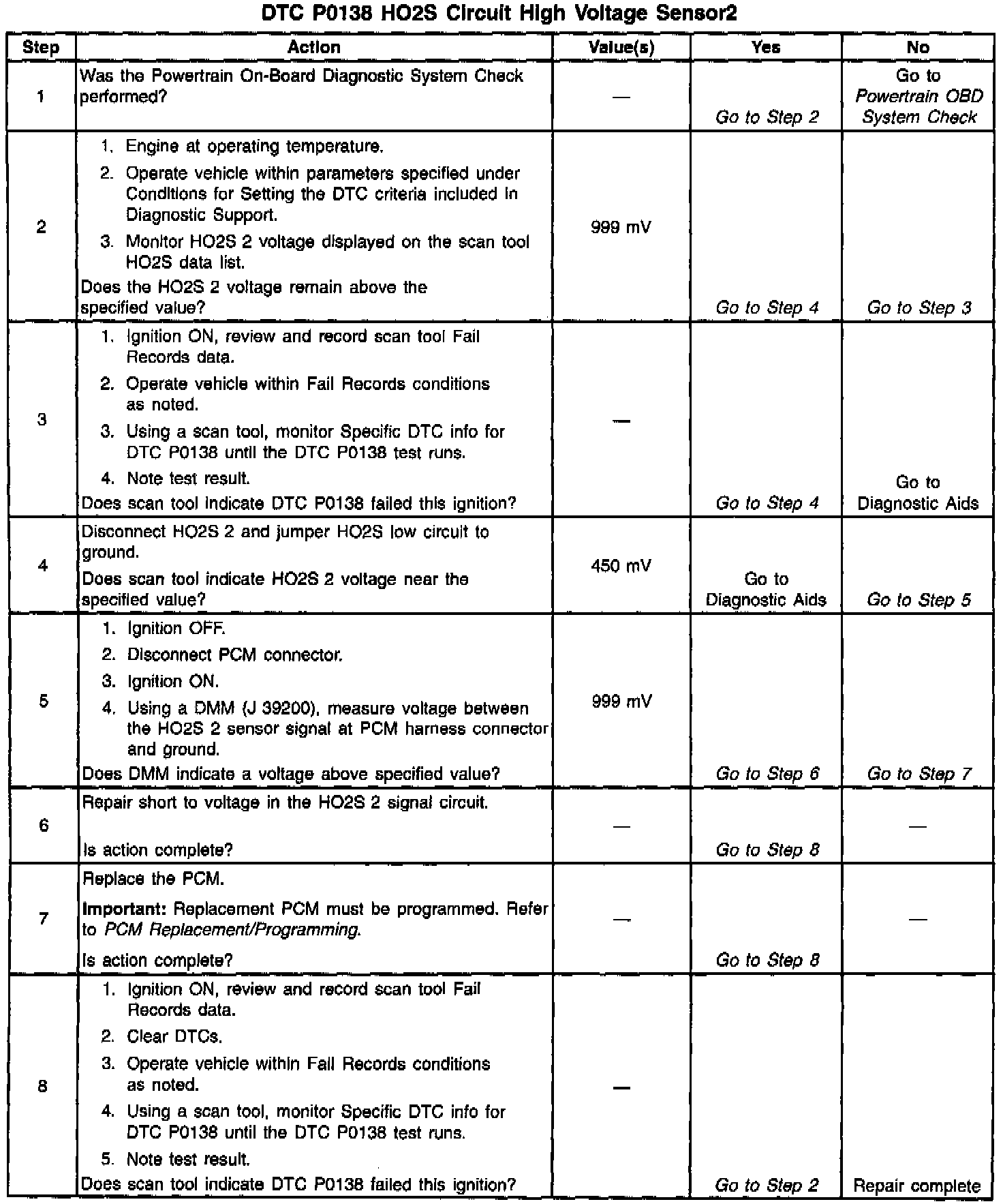 3. DTC P0138 being set during deceleration fuel mode operation may indicate a condition described in the Diagnostic Aids above. If the DTC P01 38 test passes while the Fail Records conditions are being duplicated, an intermittent condition is indicated. Reviewing the Fail Records vehicle mileage since the diagnostic test last failed may help determine how often the condition that caused the DTC to be set occurs. This may assist in diagnosing the condition.