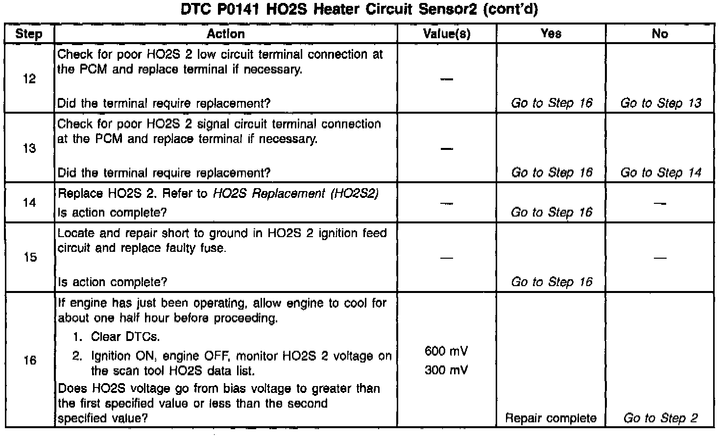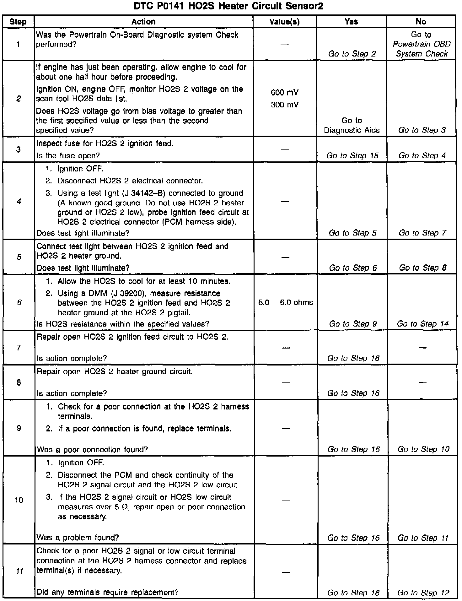 The PCM will run the heater test only after a cold start (determined by engine coolant and intake air temperature at the time of start-up) and only once during an ignition cycle. When the engine is started the PCM will monitor the HO2S voltage. When the Bank HO2S voltage indicates a sufficiently active sensor, the PCM looks at how much time has elapsed since start-up. If the PCM determines that too much time was required for the HO2S 2 to become active, a DTC P0141 will set. The time it should take the HO2S to reach operating temperature is based on the engine coolant temperature at start-up and the average Mass Air Flow since start-up (higher average airflow or higher start-up engine coolant temperature = shorter time to HO2S activity).