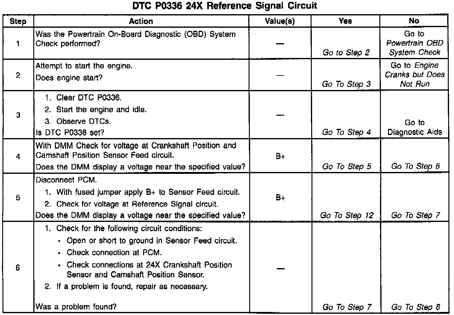 The 24X reference signal is used to improve idle spark control at low engine speeds. The PCM uses the 24X reference signal to calculate engine rpm and crankshaft position at engine speeds below 1600 rpm. The PCM constantly monitors the number of pulses on the 24X reference circuit and compares the number of 24X reference pulses to the number of 3X reference pulses and Camshaft (CAM) signal pulses being received. If the PCM receives an incorrect number of pulses on the 24X reference circuit, DTC P0336 will set and the PCM will use the 3X reference signal circuit for fuel and ignition control. The engine will continue to start and run using the 3X reference and CAM signals only.