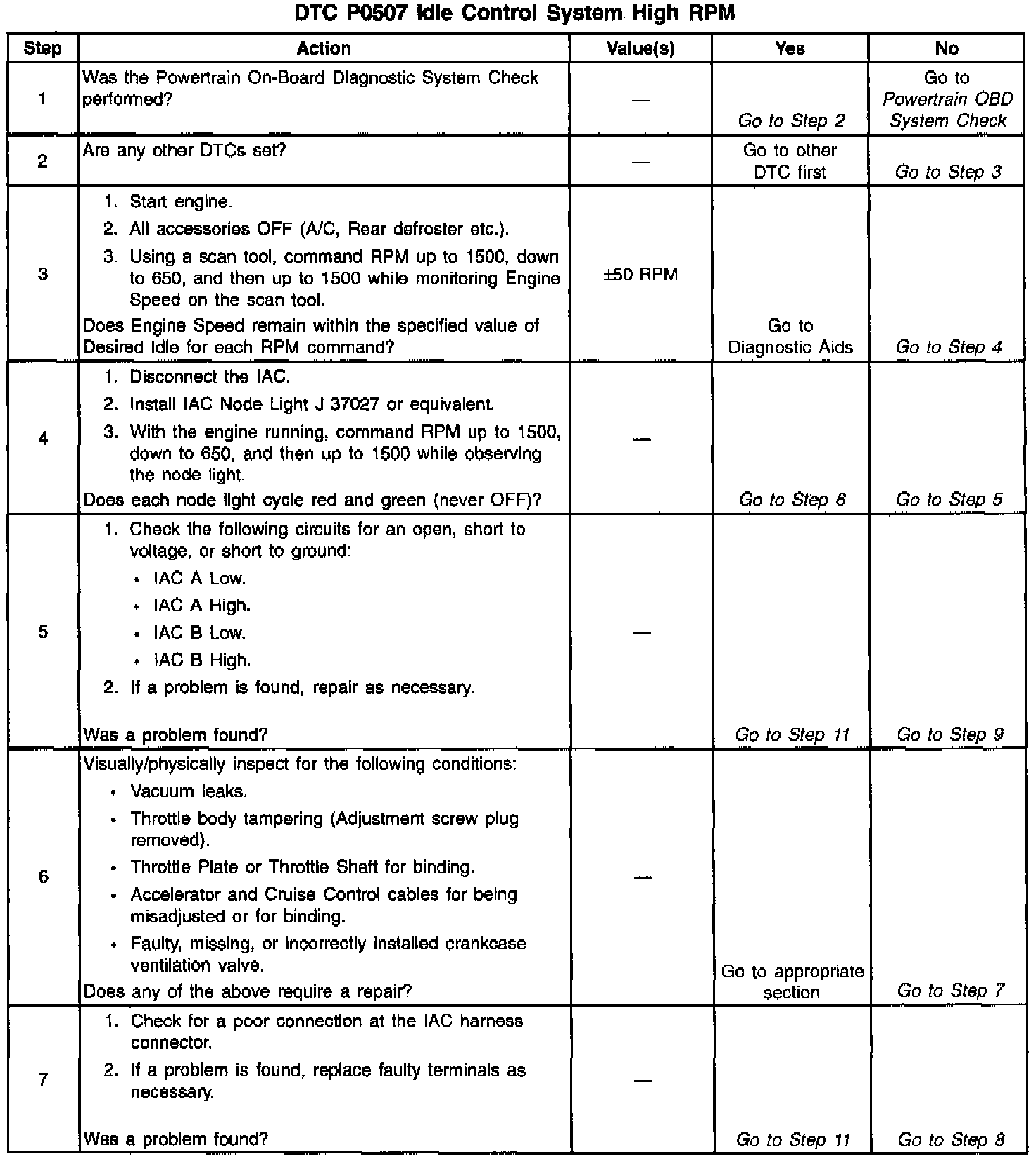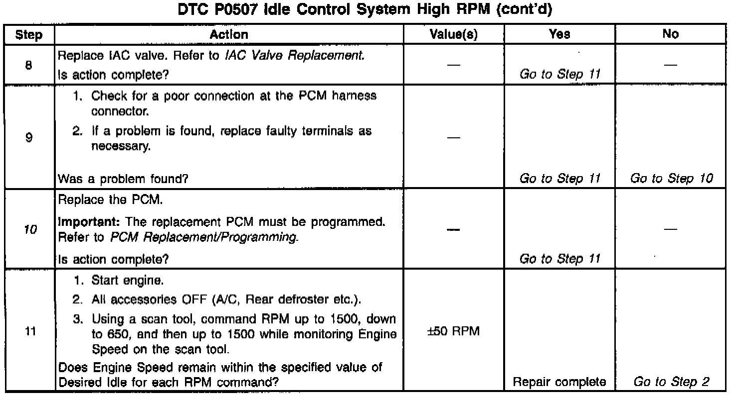 The PCM controls engine idle speed by adjusting the position of the Idle Air Control (IAC) motor pintle. The IAC is a bi-directional motor driven by two coils. The PCM applies current to the IAC coils in steps (counts) to extend the IAC pintle into a passage in the throttle body to decrease air flow. The PCM reverses the current to retract the pintle, increasing air flow. This method allows highly accurate control of idle speed and quick response to changes in engine load. If the PCM detects a condition where too high of an idle speed is present and the PCM is unable to adjust idle speed by decreasing the IAC counts, DTC P0507 will set indicating a problem with the idle control system.