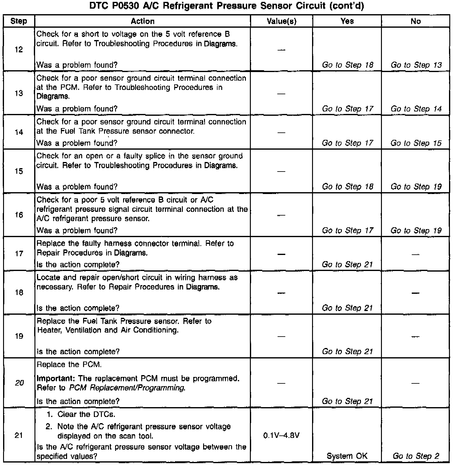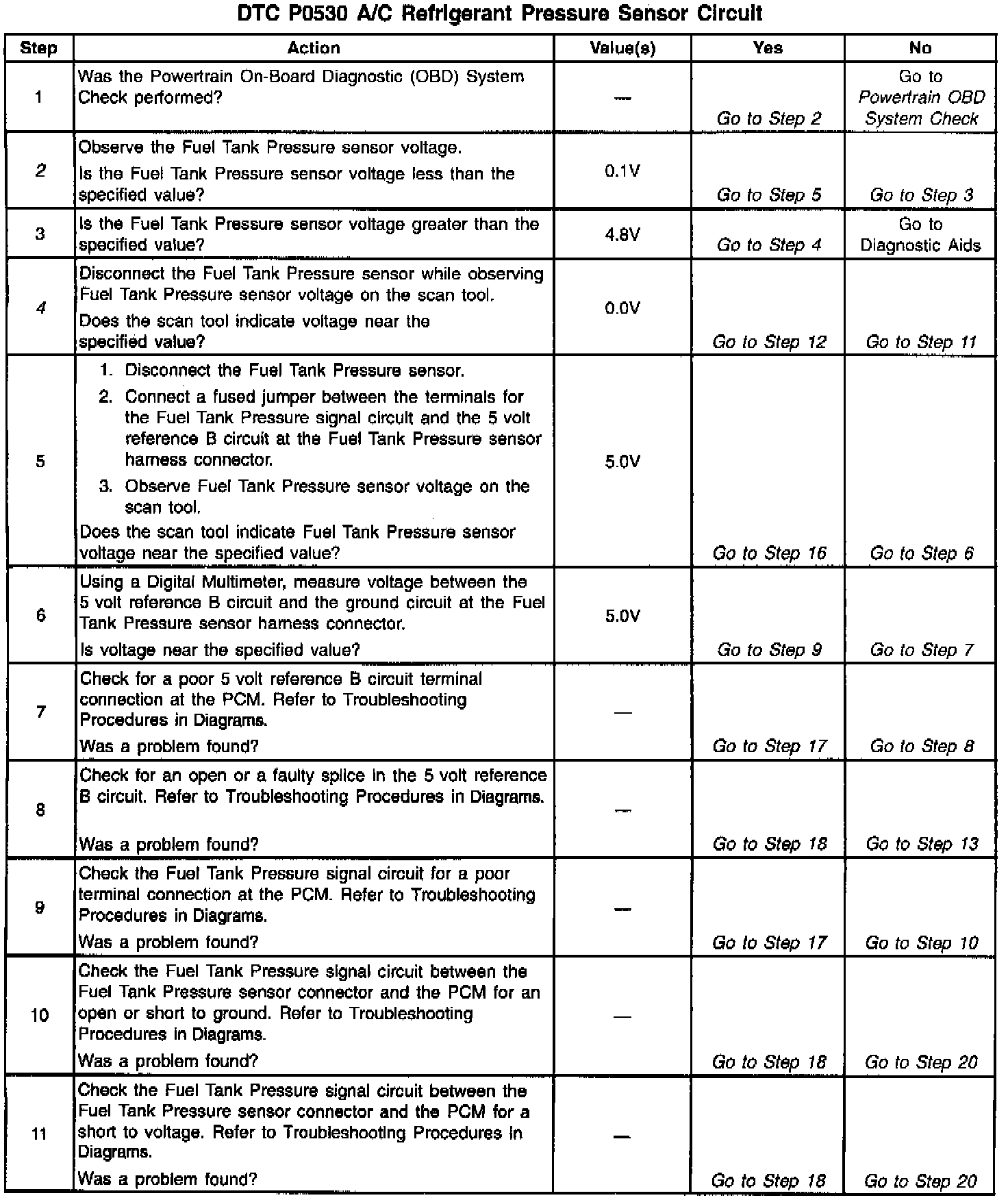 2. Normal A/C pressure sensor signal voltage is between 0.1 and 4.8 volts. If A/C voltage is within range, review Fail Records data to determine the conditions that were present when DTC P0530 set.