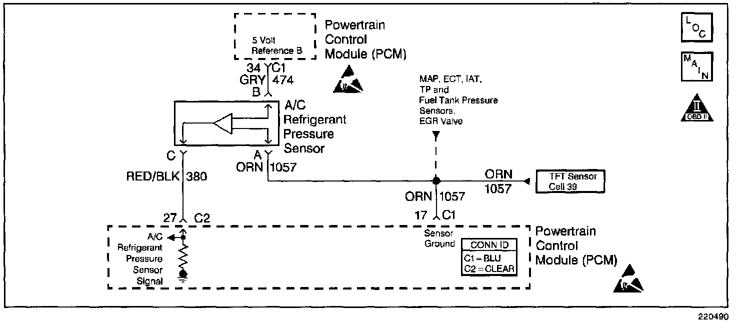The A/C refrigerant pressure sensor operates like other 3-wire sensors. The PCM applies a 5.0 volt reference and a sensor ground to the sensor. Changes in the A/C refrigerant pressure will cause the A/C refrigerant pressure input to the PCM to vary. The PCM monitors the A/C refrigerant pressure signal circuit and can determine when the signal is outside of the possible range of the sensor. When the signal is out of range (high or low) for a prolonged period of time, the PCM will set DTC P0530.When DTC P0530 is set, the PCM will not allow the A/C compressor clutch to engage. This is done to protect the compressor.