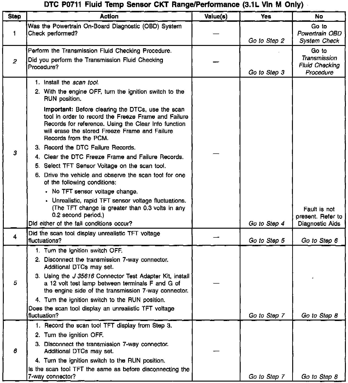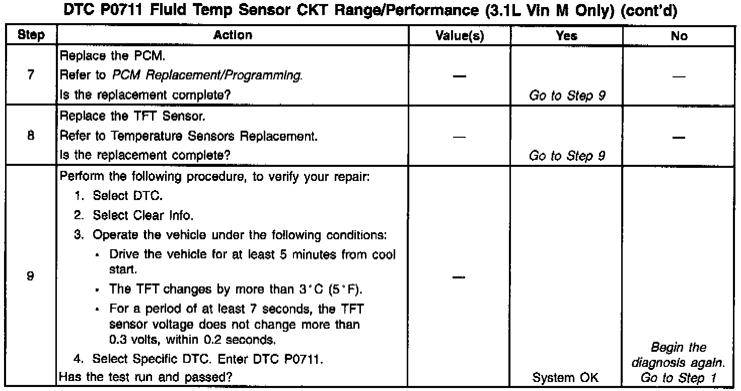If the PCM detects a large, rapid, fluid temperature change, or essentially no change from a cold start-up, then DTC P0711 sets. DTC P0711 is a type D DTC.