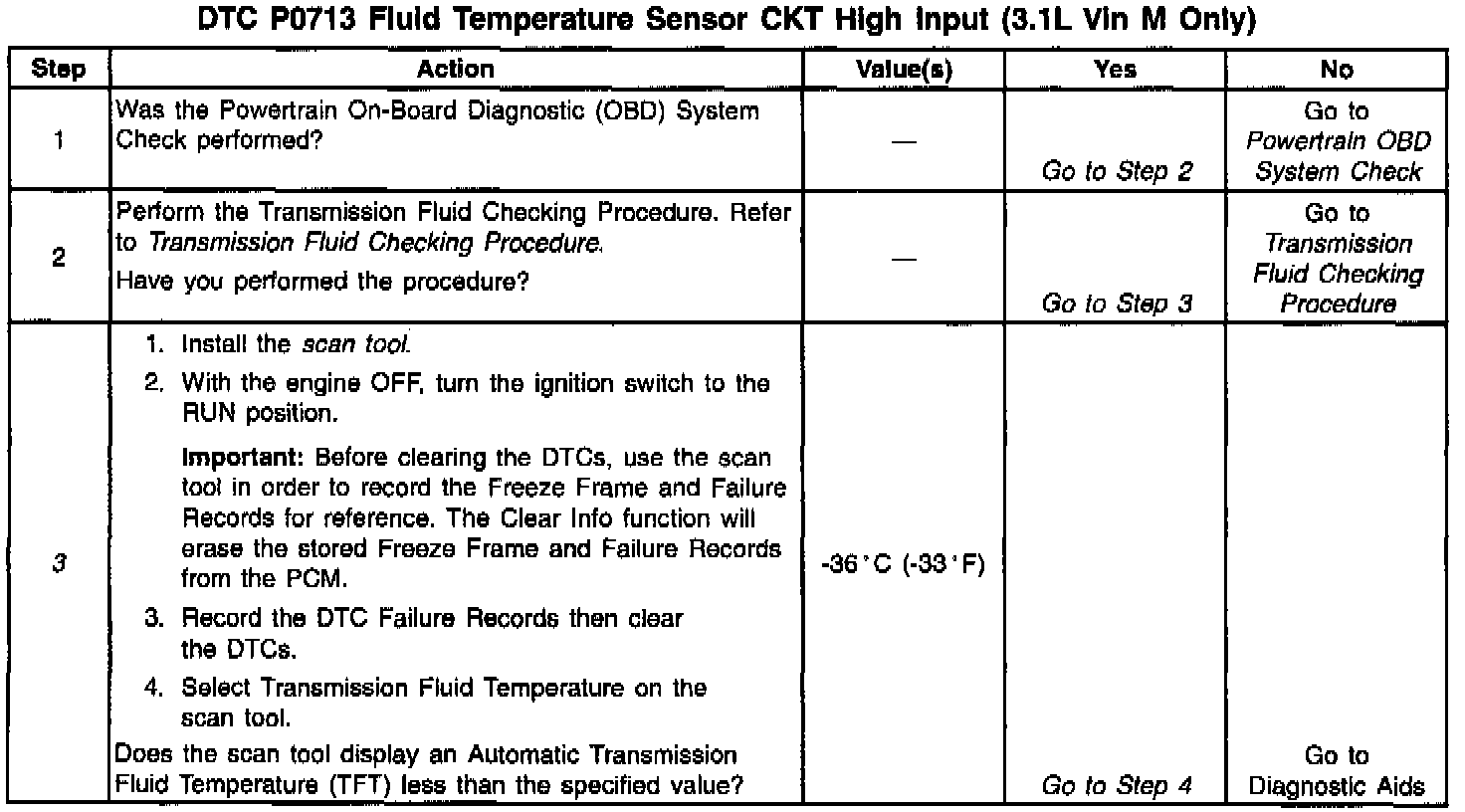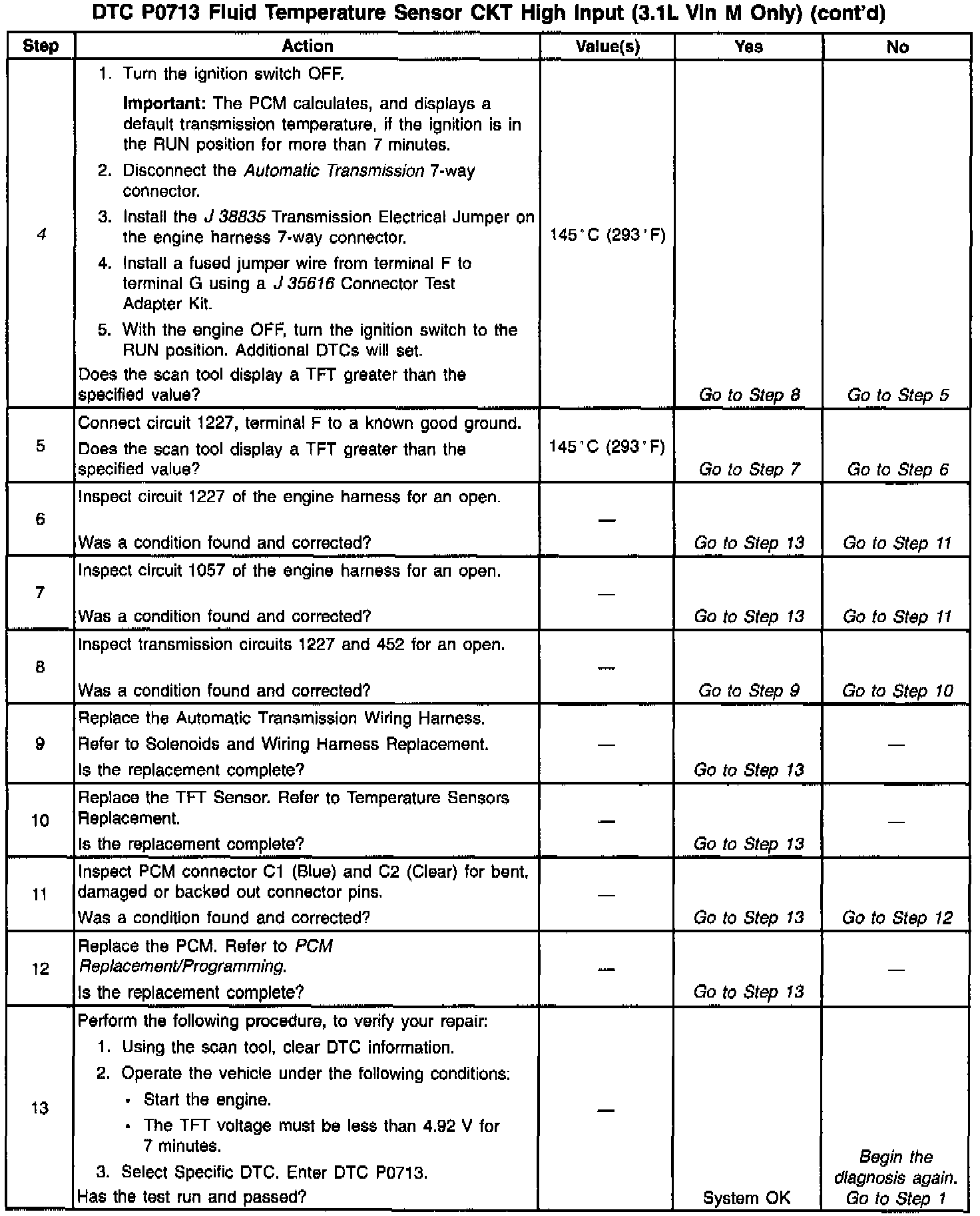 When the PCM detects a voltage input greater than 4.92 volts in the TFT Sensor circuit, indicating an open or short to power, then DTC P0713 sets. DTC P0713 is a type D DTC.