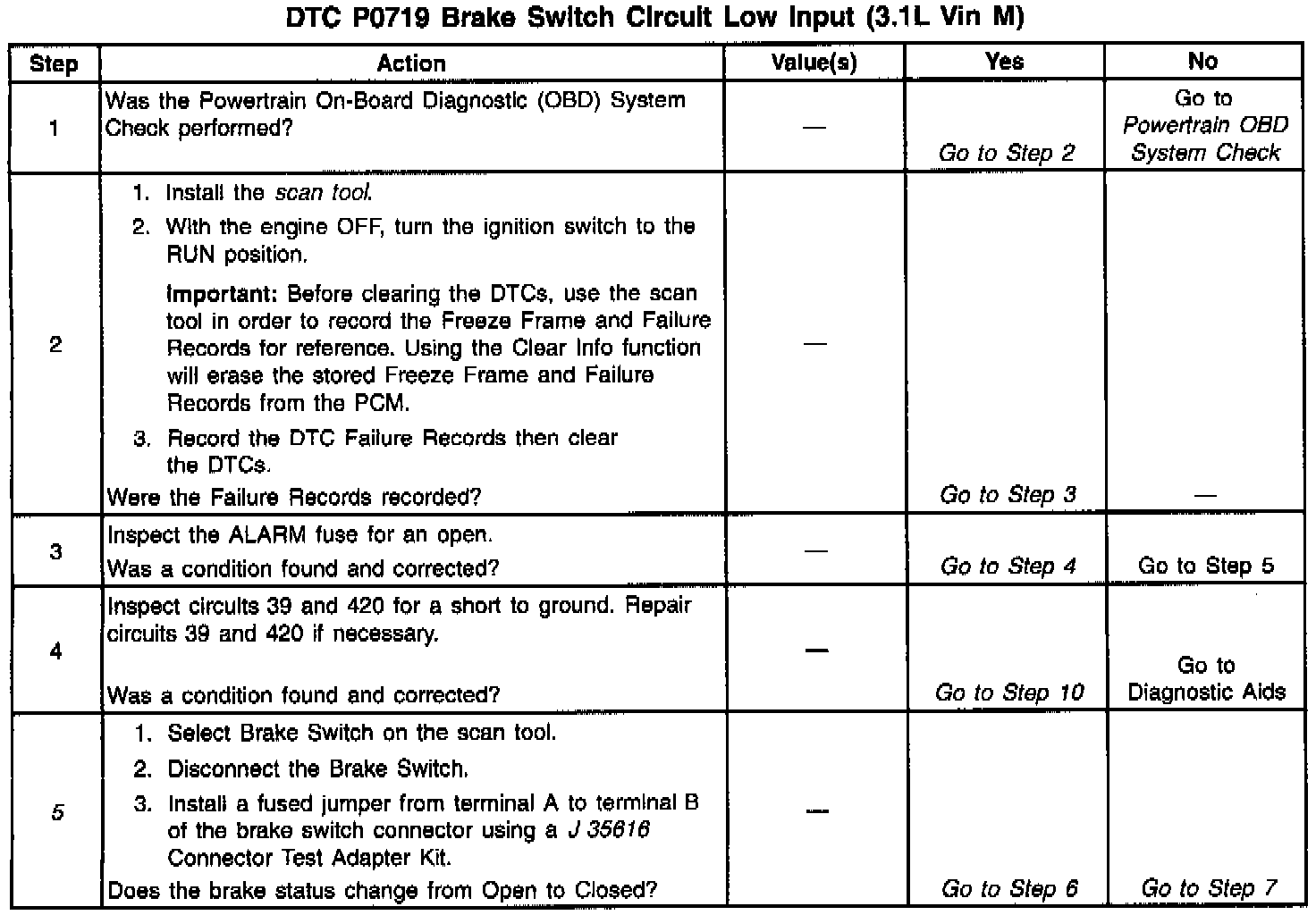 When the PCM detects an open brake switch (pedal applied) during a number of accelerations, over a continuous period of time, then DTC P0719 sets. DTC P0719 is a type D DTC.