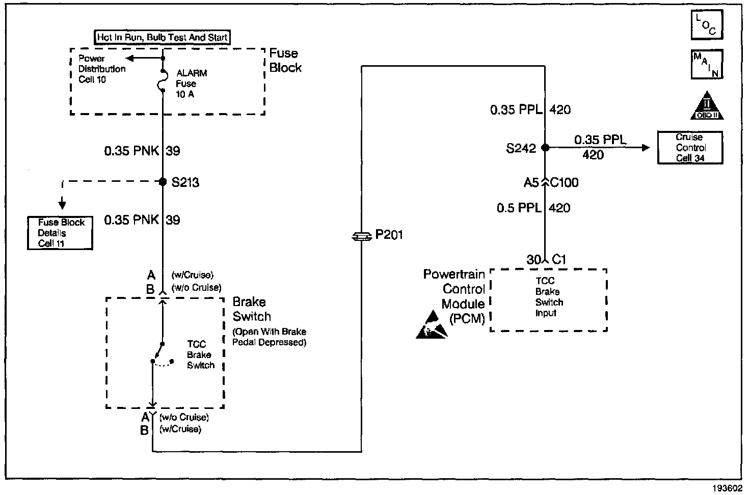The brake switch reports brake pedal status to the Powertrain Control Module (PCM). The brake switch indicates that the brake pedal is either applied or released. The normally-closed switch supplies battery voltage on circuit 420 to the PCM. Applying the brake pedal opens the brake switch, interrupting voltage to the PCM. If the PCM receives a zero voltage signal at the brake switch input, and the Torque Converter Clutch (TCC) is engaged, the PCM de-energizes the Torque Converter Clutch Solenoid Valve (TCC Sol. Valve). The PCM disregards the brake switch input for TCC scheduling if there is a brake switch circuit fault (Refer to Diagnostic Aids).