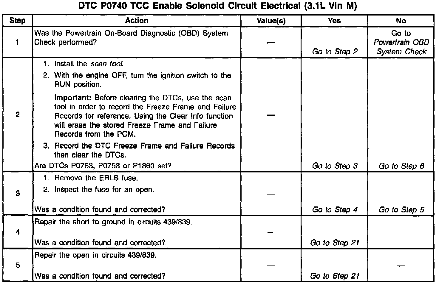 When the PCM detects a continuous open or short to ground in the TCC Solenoid circuit then DTC P0740 sets. DTC P0740 is a type A DTC.