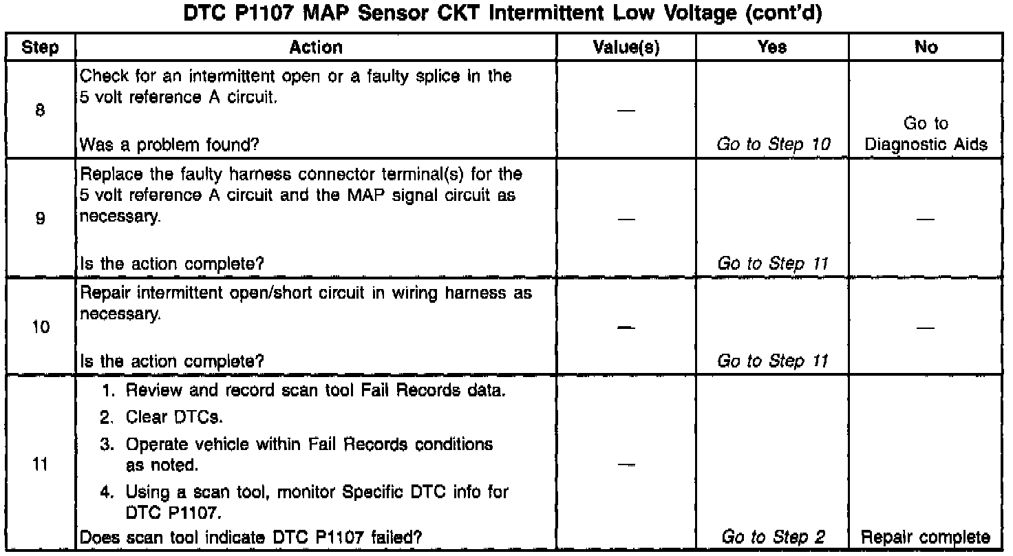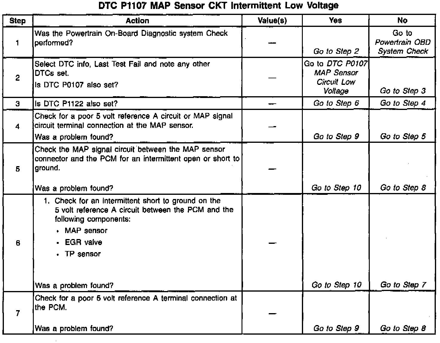 The Manifold Absolute Pressure (MAP) sensor responds to changes in intake manifold pressure (vacuum). The Manifold Absolute Pressure (MAP) sensor signal voltage to the PCM varies from below 2 volts at idle (high vacuum) to above 4 volts with the key ON, engine not running or at wide-open throttle (low vacuum). The MAP sensor is used to determine manifold pressure changes while the linear EGR flow test diagnostic is being run (refer to DTC P0401), to determine engine vacuum level for some other diagnostics and to determine Barometric Pressure (BARO). The PCM monitors the MAP signal for voltages outside the normal range of the MAP sensor. It the PCM detects a MAP signal voltage that is intermittently low, DTC P1107 will be set.