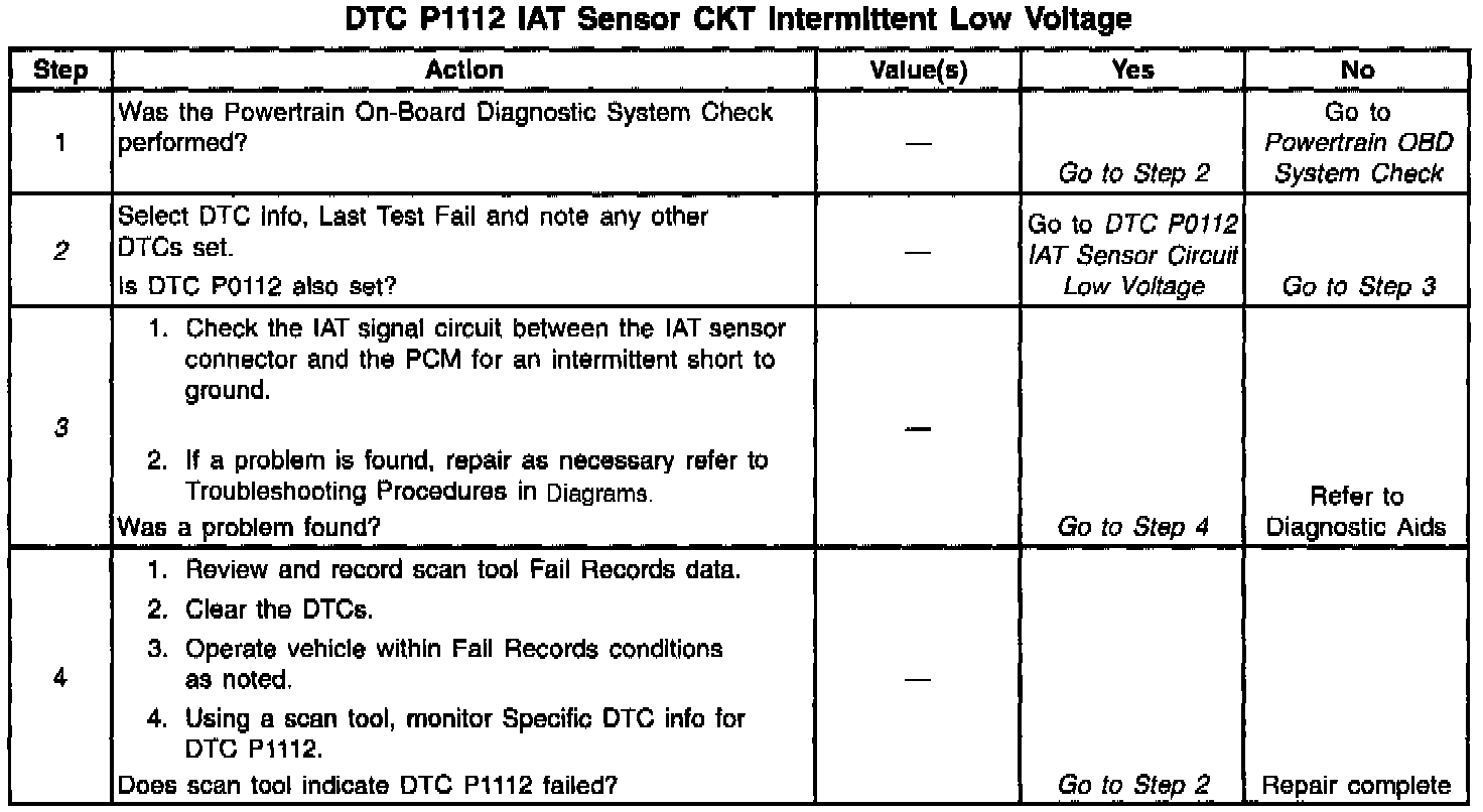 The Intake Air Temperature (IAT) sensor is a thermistor which measures the temperature of the air entering the engine. The PCM applies voltage through a pull-up resistor to the IAT sensor. When the intake air is cold, the sensor resistance is high and the PCM will monitor a high signal voltage on the IAT signal circuit. If the intake air is warm, the sensor resistance is lower causing the PCM to monitor a lower voltage. DTC P1112 will set when the PCM detects an intermittently low signal voltage on the intake air temperature sensor signal circuit.