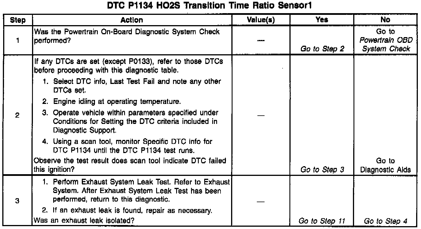 The PCM continuously monitors the Heated Oxygen Sensor (HO2S) activity for 100 seconds. During the monitor period the PCM counts the number of times that the HO2S responds from rich to lean and from lean to rich and adds the amount of time it took to complete all transitions. With this information, an average time for all transitions can be determined. The PCM then divides the rich to lean average by the lean to rich average to obtain a ratio. If the HO2S transition time ratio is not within range, DTC P1134 will be set, indicating that the oxygen sensor is not responding as expected to changes in exhaust oxygen content