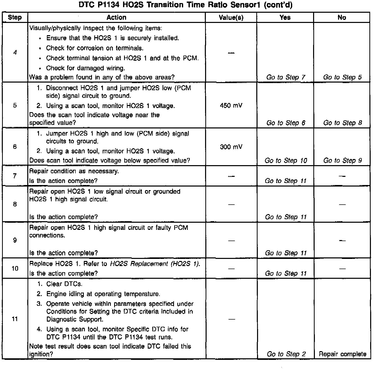 A malfunction in the HO2S heater ignition feed or ground circuit may cause a DTC P1134 to set. Check HO2S heater circuitry for intermittent faults or poor connections. If connections and wiring are OK and DTC P1134 continues to set, replace the Front Heated Oxygen Sensor (HO2S 1).