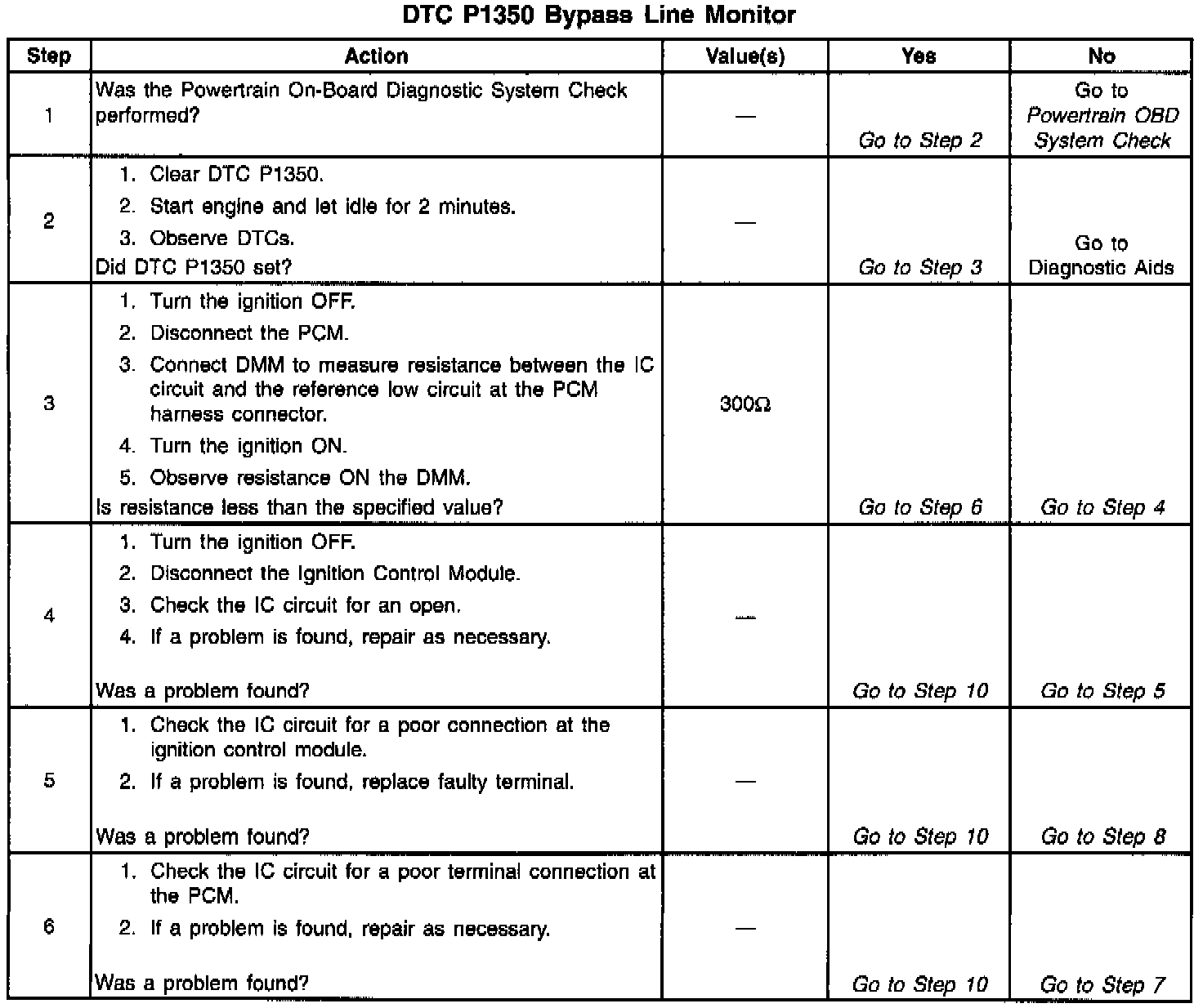 The Ignition Control Module (ICM) sends signals that the PCM requires for fuel control and spark advance calculations. At the start of engine crank, the Ignition Control Module (ICM) controls spark advance (Bypass mode.) When the second 3X reference pulse is recognized by the PCM, the PCM applies 5 volts to the Bypass circuit, commanding the ICM to switch spark advance to PCM control (IC mode). An open in the Ignition Control (IC) circuit or a short to voltage in the Bypass circuit at start-up will cause the PCM to monitor IC pulses during crank, when the ICM should be grounding the IC circuit. This condition will set DTC P1350. The engine may be started but will run on Bypass mode timing.