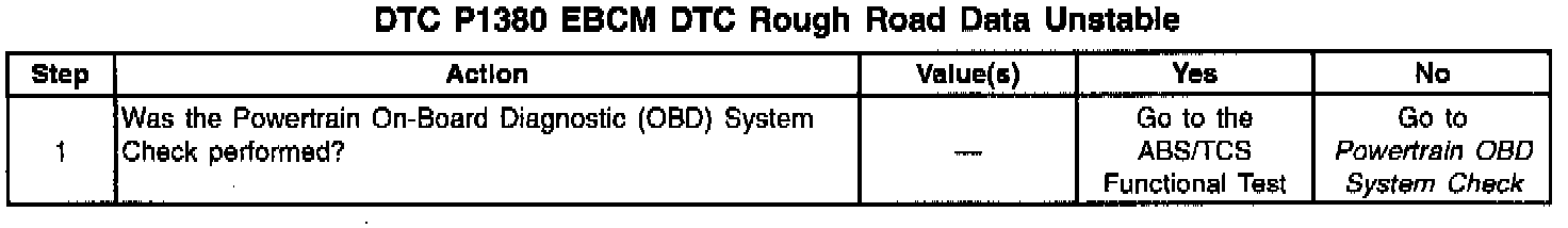 DTC P1380 set indicates that the ABS/TCS system has detected a malfunction which will not allow the EBCM/EBTCM to transmit correct rough road data to the PCM. The Diagnostic System Check in ABS Brakes should be used to diagnose this condition.