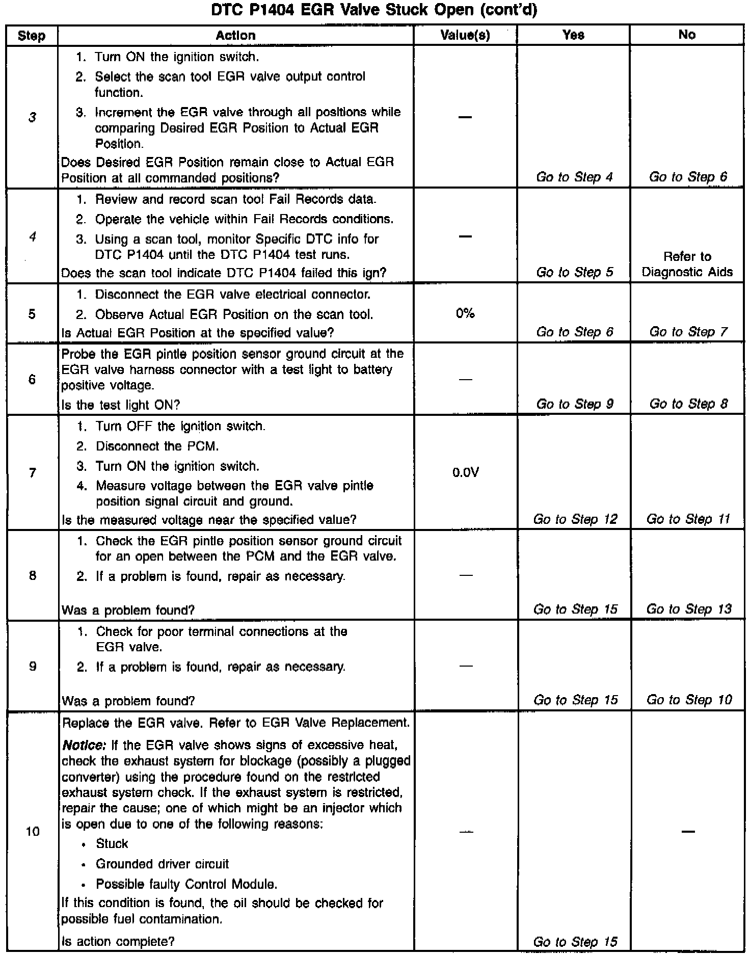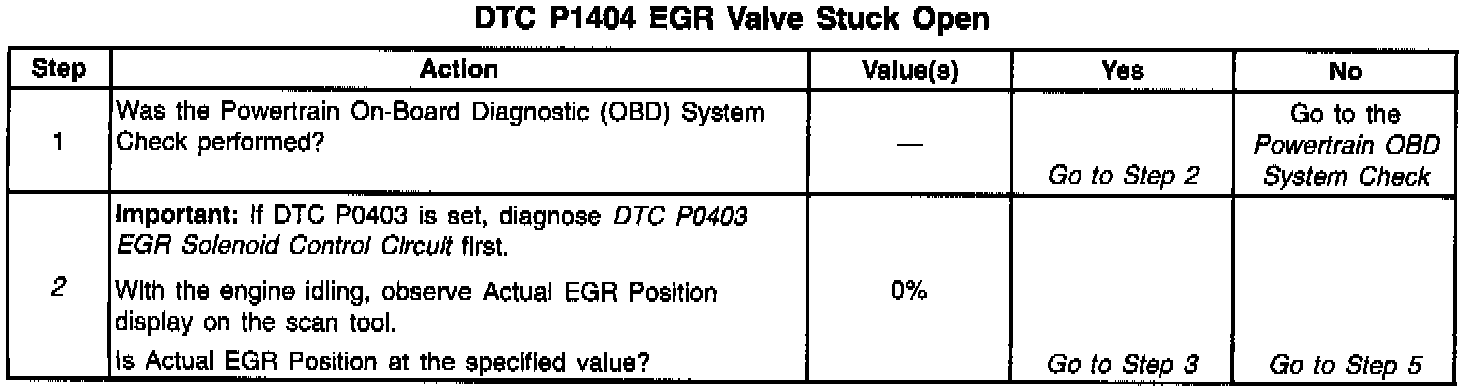 The PCM monitors the EGR valve pintle position input to ensure that the valve responds properly to commands from the PCM. When the ignition switch is turned on, the PCM learns the EGR closed valve pintle position. The PCM compares the learned EGR closed valve pintle position to the Actual EGR position when the EGR valve is commanded closed. It the Actual EGR position indicates that the EGR valve is still open when the PCM is commanding the EGR valve closed, DTC P1404 will set.