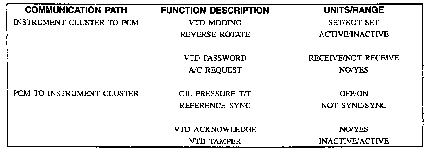 The scan tool can be used to monitor the communications between the Instrument Cluster and the Powertrain Control Module (PCM). This mode is called SDL (Serial Data Link) MONITOR on the scan tool. Refer to TABLE #2 for a listing of Vehicle Theft Deterrent Function Descriptions. This table is broken into display pairs as the scan tool lists two function descriptions per screen.