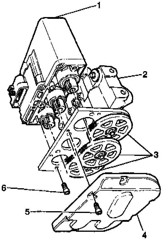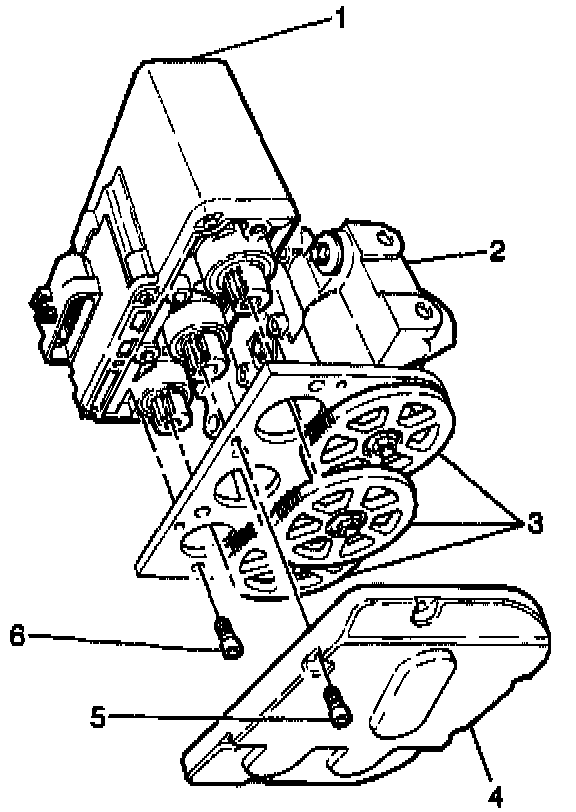 4. Remove the four Torx head screws (6) attaching the motor pack (1) to the brake modulator (2).